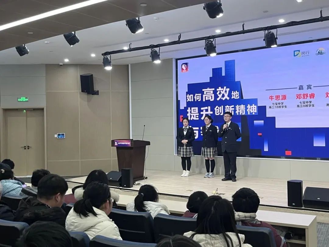 当日,报告厅内座无虚席,不少小观众与家人早早来到现场,对读书会满怀期待。活动伊始,来自七宝中学高二、高三年级的三位优秀学生牛思源、刘晓航、邓舒睿成为了全场焦点。他们以自己在校研究的课题为中心,在分享、交流中,与同龄人擦出智慧火花。