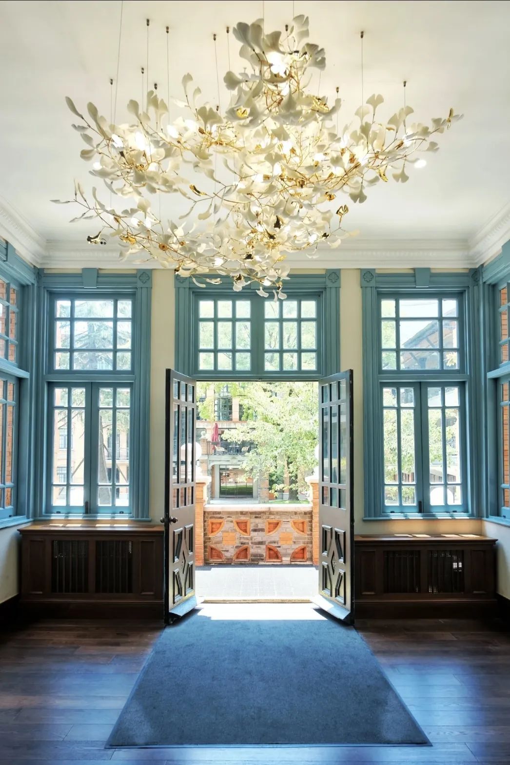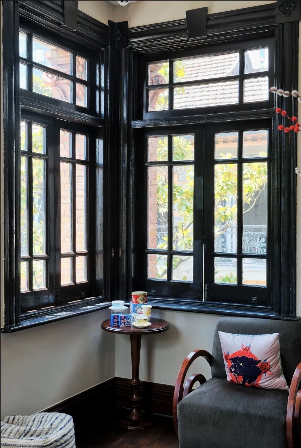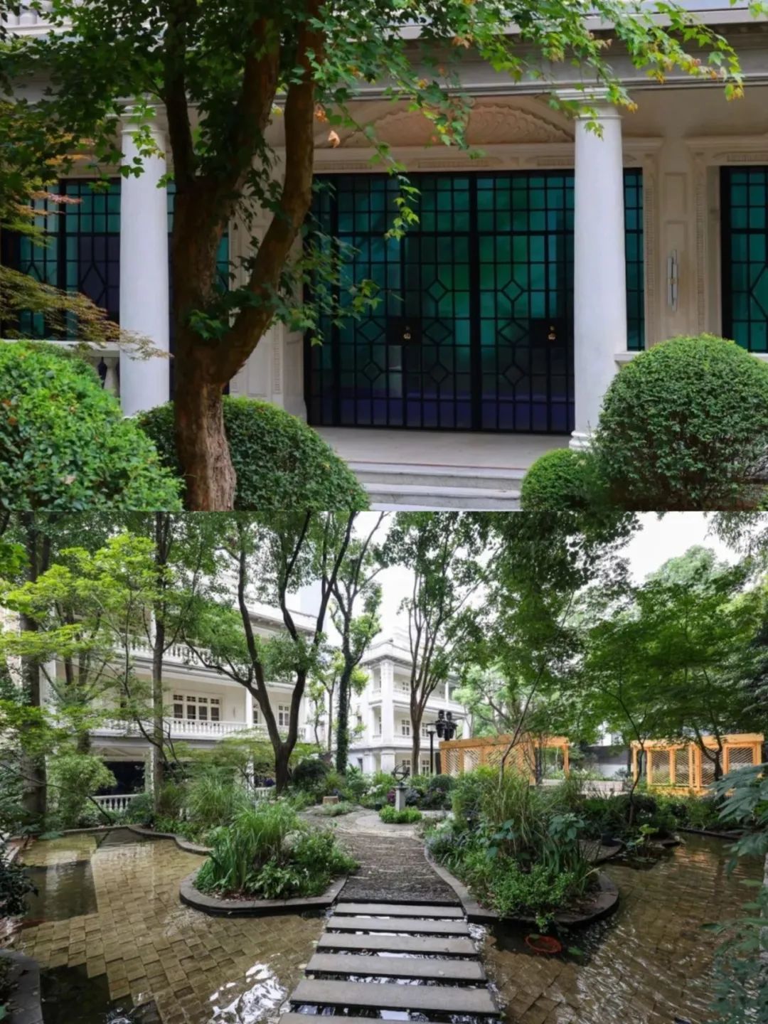 双子别墅楼梯旋转空间,也是许多市民热衷拍照的打卡点,彩绘玻璃在阳光的照耀下美轮美奂。花园融合东西方园林艺术的风格,闲适自由,树木葱茏,移步换景,充分体现了海派建筑与园林之美。