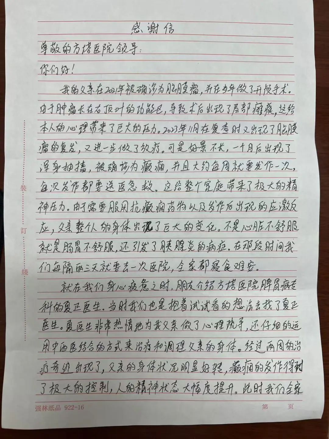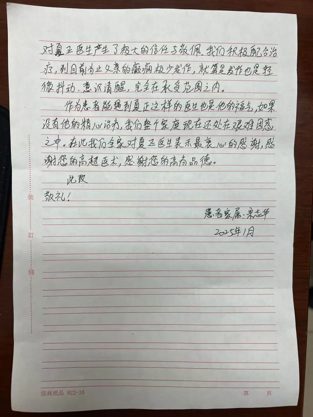 去年6月,宋先生因脑膜瘤病情变化再次开始放疗,又出现癫痫大发作。夏正在加减前方基础上为宋先生治疗,此后宋先生癫痫大发作至今未再出现。尽管脑膜瘤相关治疗仍未停止,但是宋先生和家属已重拾信心。一封感谢信,不仅是对夏正医生的感谢,更是对中医治疗癫痫的认可。