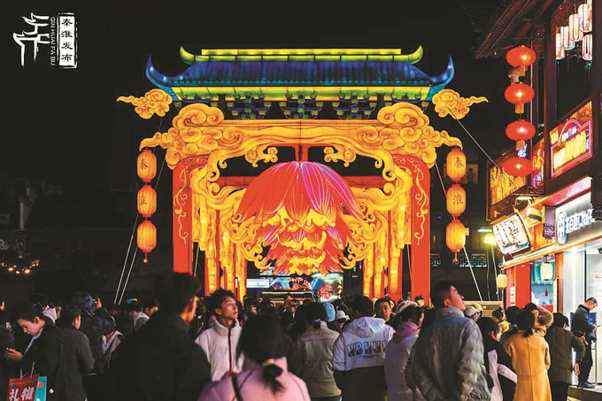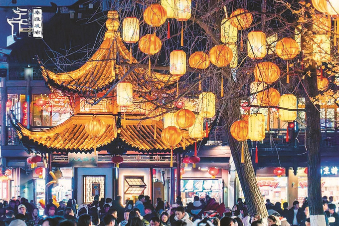 中国旅游研究院发布报告显示,春节假期,夫子庙—秦淮风光带游客量排名全国第一。作为申遗成功后的首个春节假期,广大游客竞相来到秦淮赏花灯、猜灯谜、品非遗,各式各样的光影氛围灯组将喜庆热闹的节日氛围拉满。陈煜 徐昕宇 摄