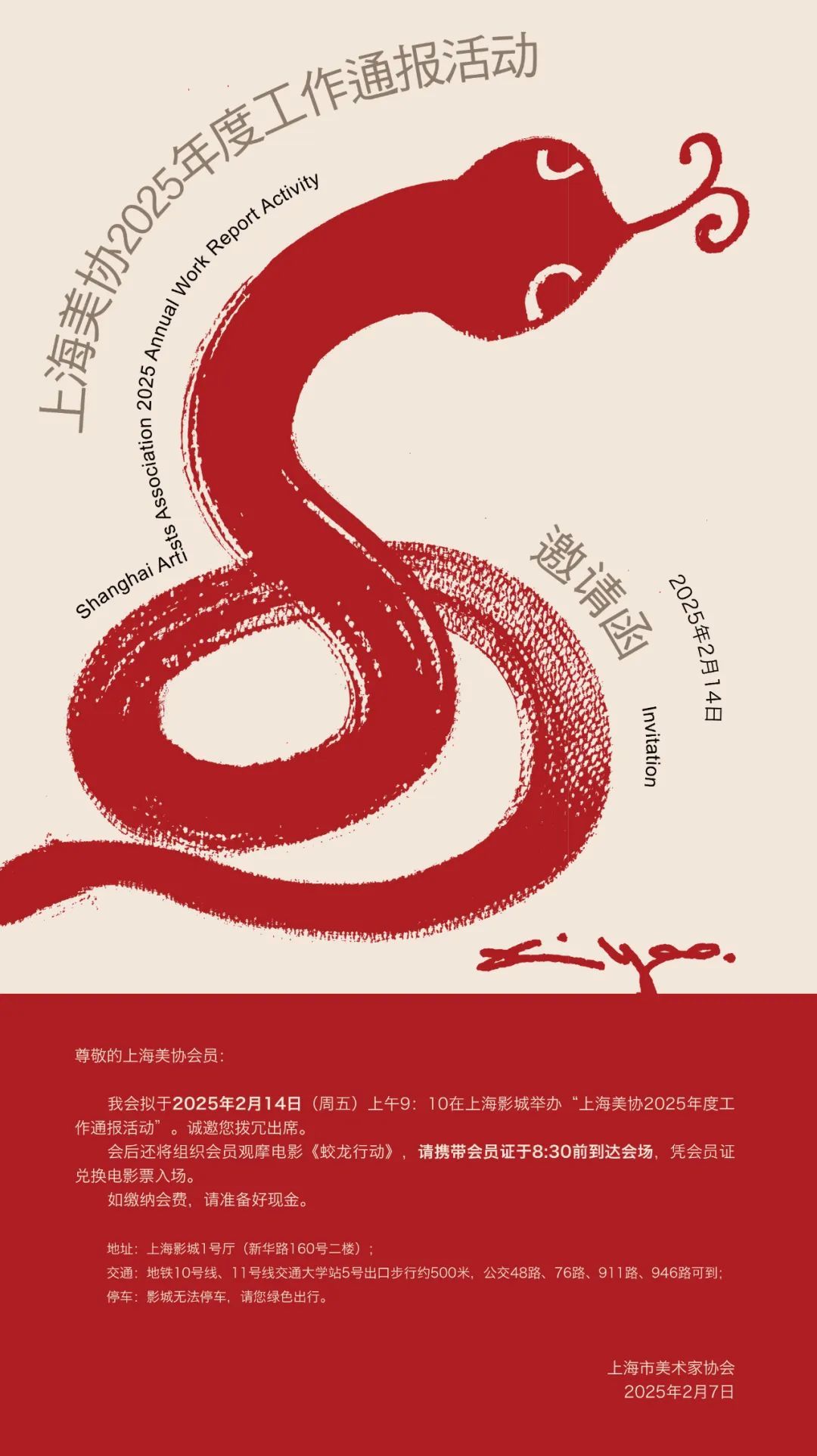 我会拟于2025年2月14日(周五)上午9:10在上海影城举办“上海美协2025年度工作通报活动”。诚邀您拨冗出席。