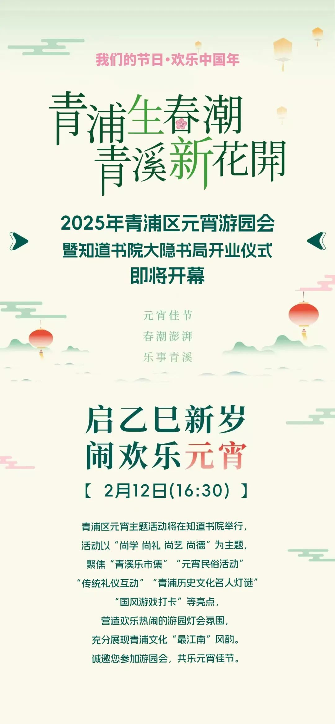 升平明月,喜闹元宵。为深入培育和践行社会主义核心价值观,进一步发挥中华传统节日的涵育教化功能,丰富群众精神文化生活,营造欢乐祥和、喜庆热闹、文明向善的浓厚节日氛围,由中共青浦区委宣传部指导,区文明办、区新时代文明实践中心、区文旅局、团区委、区妇联、区新城办、夏阳街道、新城公司、大隐书局联合主办的2025年青浦区“我们的节日·欢乐中国年”元宵游园会暨知道书院·大隐书局开业仪式将于明天(2月12日)16:30在知道书院举行。以古代书院为背景,围绕“尚学”“尚礼”“尚艺”“尚德”四类传统美德主题,由古代书院院长带领游客进入沉浸式的故事情节,与历史“撞个满怀”,感受古今文化的交融与传承。