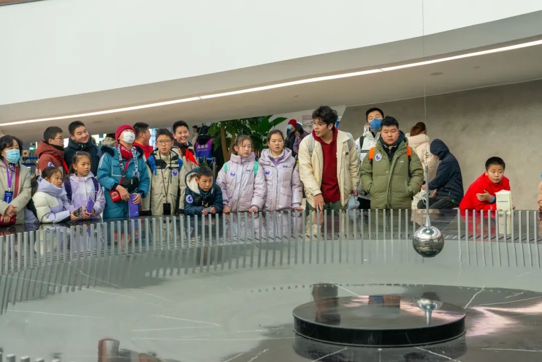 走进上海天文馆,孩子们便被巨大的“傅科摆”所吸引。摆锤在地球自转的作用下缓缓移动,摆绳从穹顶中垂下,仿佛连接着天与地,也连接着孩子们与遥远的外太空……