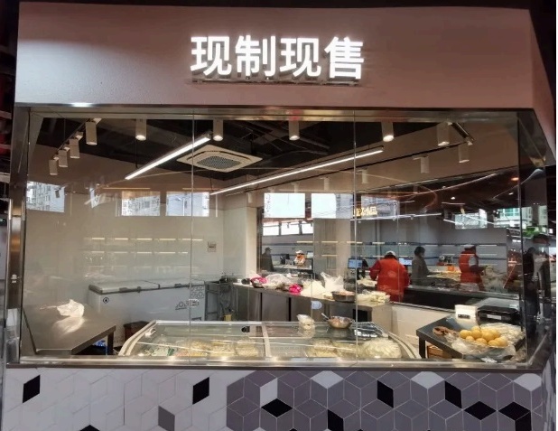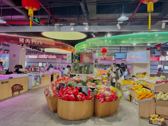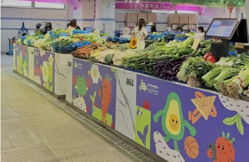 在区域规划上,菜市场采用色彩区分法,粉色代表肉类区、绿色为蔬菜区、蓝色是海鲜区、棕色是南北货区,一目了然。除传统食品销售外,还提供面制品、点心和半成品等个性化食品,从源头上减少家庭厨余垃圾的产生,有效避免食材浪费。