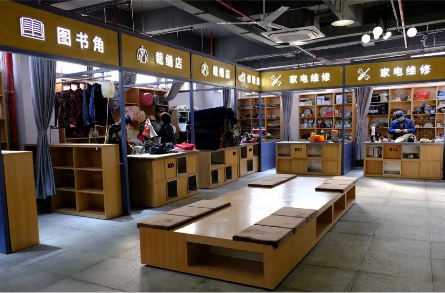 二楼右侧的便民服务站内设有纯公益性质的图书角,提供丰富的书籍供市民免费取阅;家电维修、裁缝店、修鞋店等服务摊位一应俱全,“一站式”满足居民日常生活中的“小修小补”需求,既便利了居民的生活,又延长了物品使用寿命,减少资源消耗和废物产生。