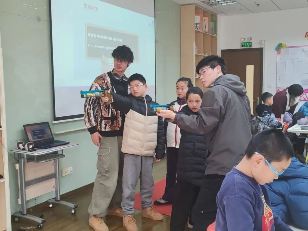 “杨树高大挺拔,枝繁叶茂,它象征着积极向上、努力进取的精神,见证了上海的跃迁与发展,承载着人们对家国的深深热爱。”刘老师为小朋友们描绘了城市的变迁故事,“人民城市人民建,人民城市为人民”理念对新时代少年的重要意义,让孩子们在轻松愉快的氛围中明白了要做一个有理想、有本领、有担当的新时代少年。当天,寒托班还为孩子们带来了射击体验活动。孩子们观看视频讲解,认真学习了射击的分解动作,并用激光枪依次体验射击,屏息观察,仔细瞄准,大胆射击,动作一气呵成,俨然一个个“小小神枪手”。随后的非遗竹编与剪纸活动同样充满了创意与乐趣。孩子们用竹条认真编织相框背景,并装裱福字。压一挑三,横纵交叉,零散的竹条在他们的小手中穿梭着,很快编成了多彩的图案。