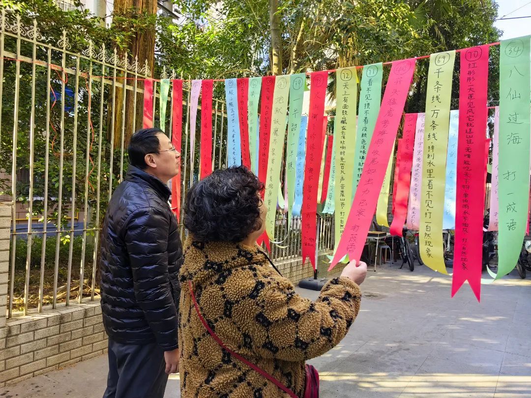 田林八九十居民区的“闹元宵·猜灯谜”庆祝元宵主题在广场上进行。上百条灯谜悬挂于广场中央,内容涵盖成语、俗语、地名等,既有经典题目,也不乏趣味创新。活动现场还设置了亲子互动游戏,家长与孩子配合完成“元宵接力赛”,笑声此起彼伏。