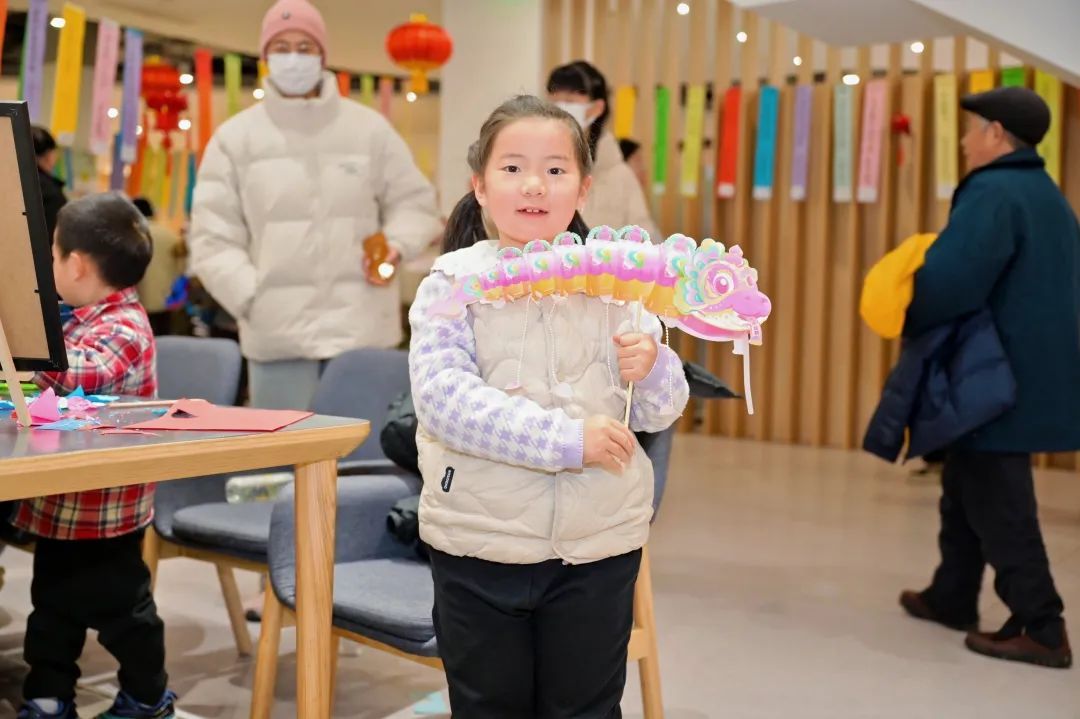 亲子互动区,小朋友们围成一团,像一群专注的“小工匠”,认真地裁剪、拼接、装饰,不一会儿,一盏盏超萌蛇灯就诞生了。陪孙女来做灯的爱建园李阿姨笑着说:“做彩灯是阿拉元宵节的老传统,全家人一道点亮福气!”