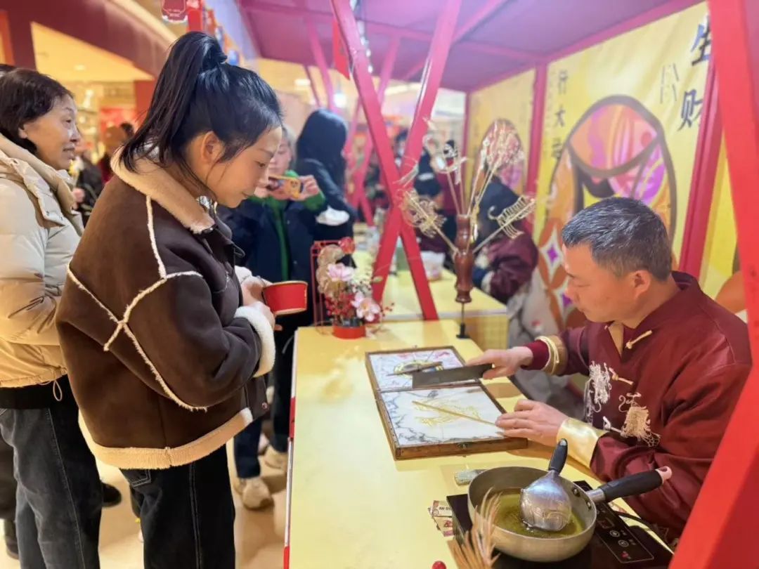 龙凤字摊位上,艺人们笔锋游走间,一个个刚劲有力又充满艺术美感的龙凤字跃然纸上。糖画摊位总是围满了孩子,手工艺人熟练地舀起一勺金黄的糖稀,在光洁的石板上快速勾勒,形态各异的糖艺作品让人赞叹不已。面人摊位上,手工艺人手中的面团仿佛被赋予了生命。他通过捏、搓、揉、掀等手法,再用小竹刀巧妙地点、切、刻、划,一个个栩栩如生的面人就诞生了。香囊摊位提供了多种花草香型的香囊,参与者可以根据个人喜好选择。此外,还有编手绳摊位教授如何使用彩线编织出精美的手绳,而草编摊位展示了将自然材料转化为艺术品的过程。