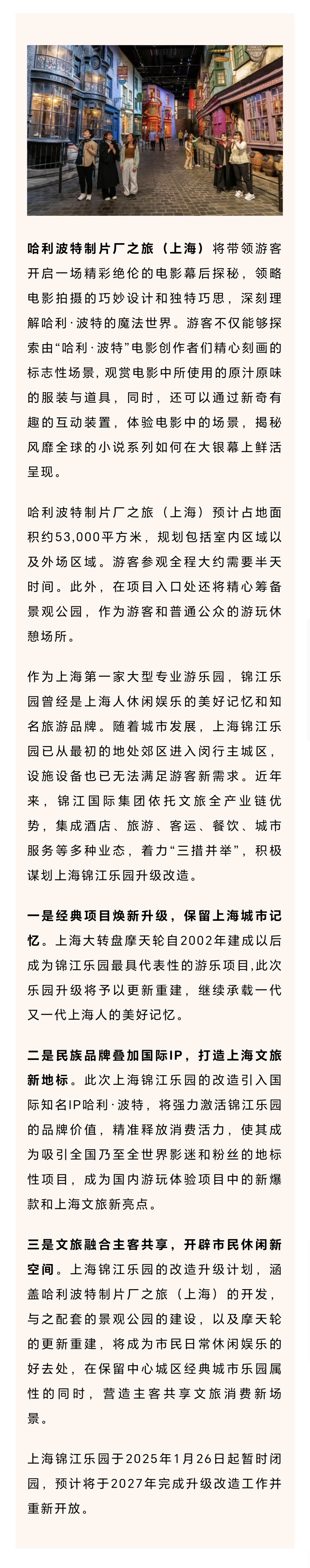 市文化旅游局介绍,2025年2月12日,锦江国际集团宣布与全球领先的媒体和娱乐集团华纳兄弟探索集团全球体验事业部签署合资框架协议,共同开发华纳兄弟(上海)制片厂之旅 –“哈利·波特”的诞生(简称“哈利波特制片厂之旅(上海)”)。此项目位于上海锦江乐园,预计将于2027年开放营业。这是哈利波特制片厂之旅在中国的首次落地。目前,合资协议与项目启动仍处于监管审批阶段。详见↓