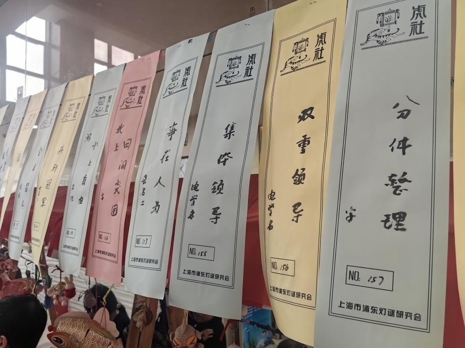 按照惯例,金海文化艺术中心一楼大厅悬挂了几百条由上海市浦东灯谜研究会专门设计的灯谜。而与众不同的是,前来猜灯谜的居民纷纷拿着手机,借助科技的力量解题。