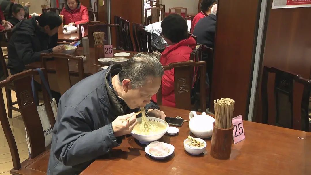 每年的季节时令美味,一碗刀鱼汁面配上一份肴肉,用老饕们的话来说就是“绝配”。市民钟老伯是老半斋的常客,得知刀鱼汁面第一天上市,特地来尝鲜。“这里的刀鱼汁面是特色,这个加工工艺是独门绝技,虽然其中的门道讲不出,但是鲜头特别足,这是上海滩第一光面,加肴肉是绝配。再加点胡椒粉吊个鲜头,用上海话说是‘眉毛也要掉下来了’。”