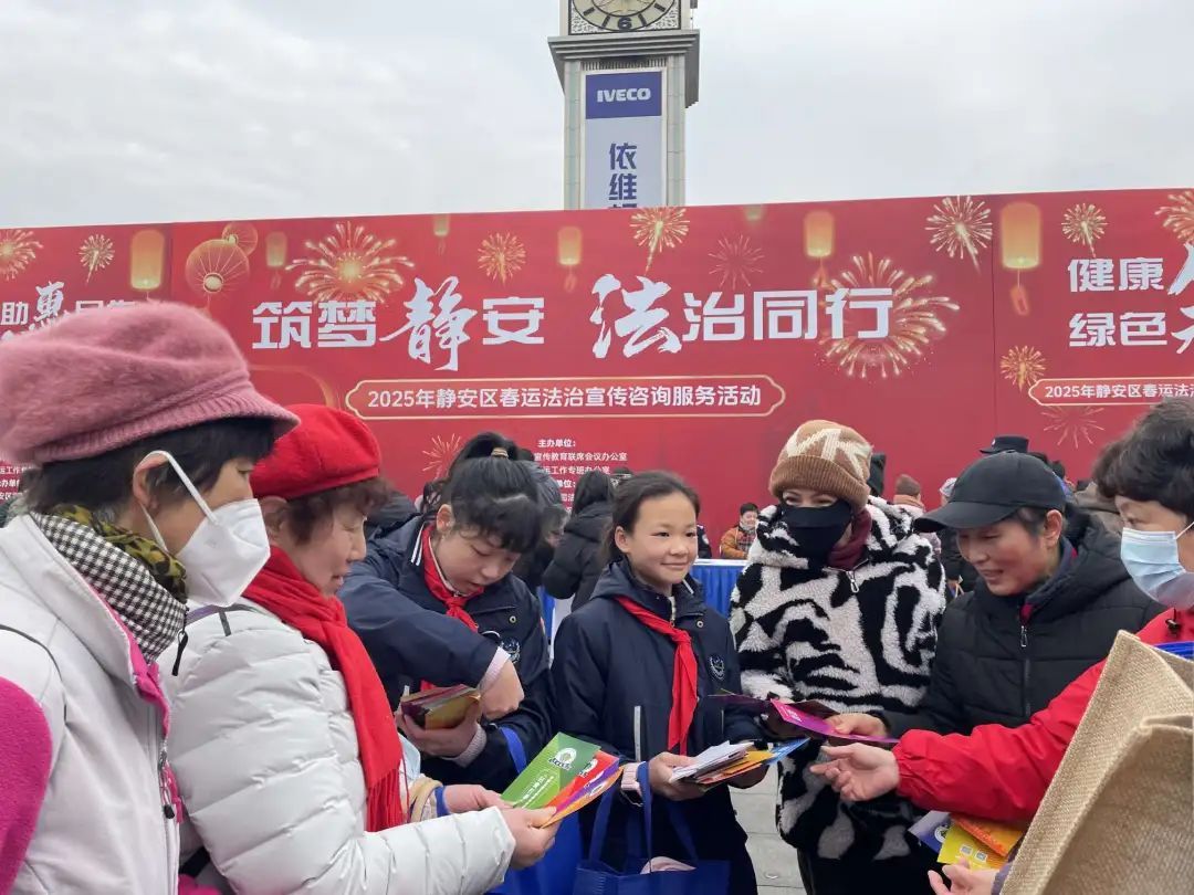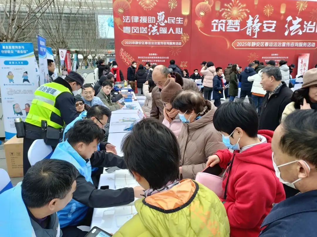 2月12日,静安区在上海站南广场世博钟楼下举行2025年春运法治宣传咨询服务大型现场活动。