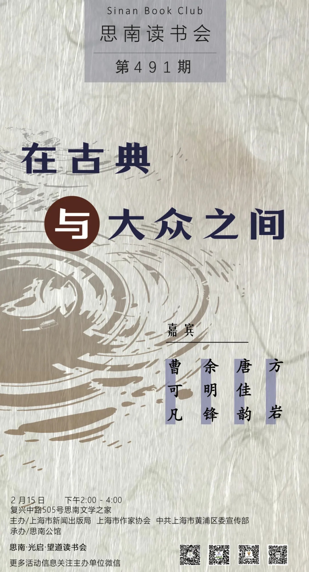 今年2月15日是思南读书会第十一个生日,我们将举办特别活动,内容包括“思南书单2024”的发布,并邀请到“思南书单2024”专家组、跨界组、读者组的评委代表,进行一场主题为“大众与古典之间”的阅读对谈。