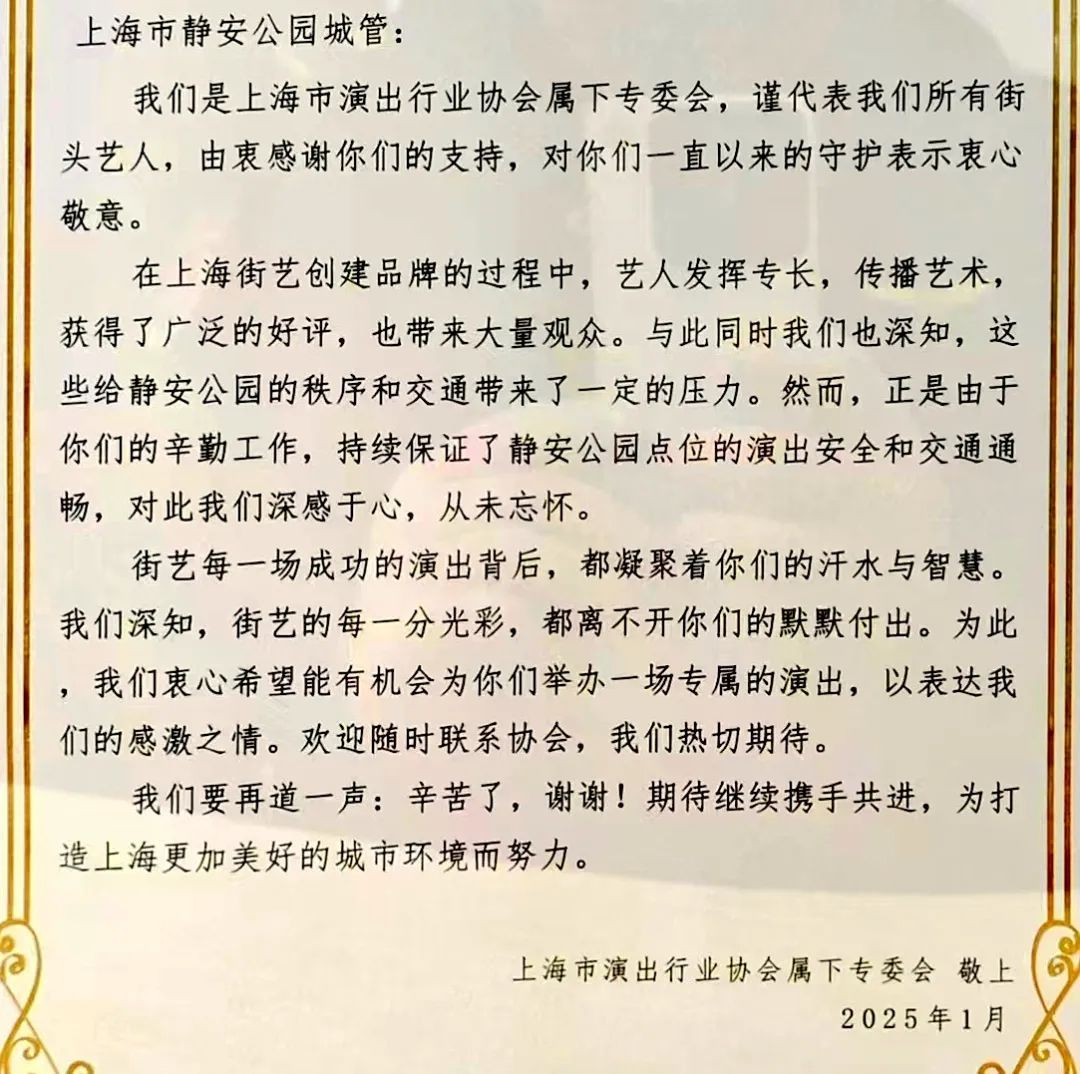 近日,静安寺街道综合行政执法队(城市管理行政执法中队)收到一封来自上海市演出行业协会下属专委会的感谢信。信中,协会代表全体街头艺人感谢全体执法队员长期以来对街头艺术的支持与守护。字里行间既有对城管工作的理解、对队员们工作的敬意,更折射出城市管理与社会生活的温情互动和双向奔赴。