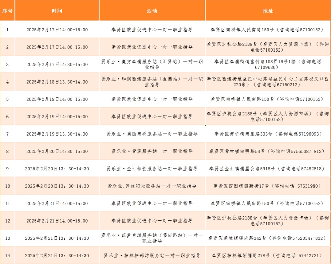 下周活动预告 2月17日~2月21日 点击下方链接查看“个人预约职业指导”操作指引 “个人预约职业指导”操作指引 贤乐业· / 活动主题 / 人人乐业 15分钟就业圈微聘会 / 活动时间 / 2025年2月17日(星期一)14:30~15:30 / 活动地点 / 富竹路108弄16号1楼(汇贤居委) / 活动简介 / 招聘企业和岗位信息: 上海玮熠环境科技有限公司: 病媒防制 虫控防制专员 2.上海明申物业管理有限公司: 物业维修员 物业保安员 3.上海凯胜保安服务有限公司 银行网点保安员(浦东) 银行保安 银行消控室值守员 / 报名咨询 / 67109680 贤乐业· / 活动主题 / 人人乐业 15分钟就业圈微聘会 / 活动时间 / 2025年2月17日(星期一)13:30~14:30 / 活动地点 / 奉炮公路141号49号楼2楼 / 活动简介 / 招聘企业和岗位信息: 1.惟力维斯(上海)医学科技有限公司: 企划(偏设计) 市场专员/市场总监 实验室技术专员 工程设备管理员 2.阿莱德企业发展(上海): 水电工 监控室安全员 / 报名咨询 / 57121556 贤乐业· / 活动主题 / 人人乐业 15分钟就业圈微聘会 / 活动时间 / 2025年2月19日(星期三)10:00~11:00 / 活动地点 / 民乐路80弄4号 / 活动简介 / 招聘企业和岗位信息: 上海德永犁企业管理咨询服务中心: 健康知识主播 健康养身主播 知识分享主播 渠道事业部合作 2.上海明申物业管理有限公司: 物业维修员 物业保安员 / 报名咨询 / 67194979 贤乐业· / 活动主题 / 人人乐业 15分钟就业圈微聘会 / 活动时间 / 2025年2月19日(星期三)14:00~15:00 / 活动地点 / 青村镇张弄路145弄5号 / 活动简介 / 招聘企业和岗位信息: 上海埃因电线电缆有限公司: 普工 库管 销售代表 2.上海晨光文具股份有限公司:普工/操作工(人数不限)。 / 报名咨询 / 57565387-812 贤乐业· / 活动主题 / 人人乐业 15分钟就业圈微聘会 / 活动时间 / 2025年2月20日(星期四)13:30~14:30 / 活动地点 / 西渡街道益民中心路与益民中心二支路交叉口西220米 / 活动简介 / 招聘企业和岗位信息: 上海井上新艺塑料有限公司: 吹塑工程师 产品结构设计 销售 / 报名咨询 / 67150212 贤乐业· / 活动主题 / 人人乐业 15分钟就业圈微聘会 / 活动时间 / 2025年2月20日(星期四)13:30~14:30 / 活动地点 / 浦星公路5918号 / 活动简介 / 招聘企业和岗位信息: 1.阿蓓亚塑料实业(上海)有限公司:操作工30人、模具维修技术员1人、注吹技术员1人、印刷技术员1人、印刷领班1人; 2.上海金一自粘材料有限公司:生产操作工7人、印刷工3人、装箱打包工6人、包装女工5人、储备干部(生产管理方向)3人; 3.上海明寅供应链管理有限公司:仓管员2人、车间文员操作工2人、数码印刷机操作员1人、业务员1人、3D设计师1人。 / 报名咨询 / 57482818 贤乐业· / 活动主题 / 人人乐业 15分钟就业圈微聘会 / 活动时间 / 2025年2月21日(星期五)13:30~14:30 / 活动地点 / 柘林镇新塘路278号 / 活动简介 / 招聘企业和岗位信息: 盈历进出口贸易(上海)有限公司: 财务专员(要求会泰语) 泰语外贸业务员 外贸业务助理(英语口语佳) 西语外贸业务员 英语外贸业务员 2.上海威士文通风工程设备有限公司: 保洁 暖通工程师 销售工程师 2.上海明申物业管理有限公司: 物业保安员 物业维修员 / 报名咨询 / 57442721 贤乐业· / 活动主题 / 人人乐业 15分钟就业圈微聘会 / 活动时间 / 2025年2月21日(星期五)13:30~15:00 / 活动地点 / 头桥东路298号 / 活动简介 / 招聘企业和岗位信息: 1.圆通速递(奉贤)转运中心:机修运维工程师1人、装卸员10人、操作工50人; 2.上海富士电梯有限公司:保洁1人; 3.美迪科(上海)包装材料有限公司:外观检验15人、仓库管理员5人、机台操作员5人、客服1人; 4.上海绎铭机械有限公司:钳工1人、CNC加工中心3人、铣床工1人、文员1人; 5.上海嘉亿机械有限公司:售后技术人员5人、业务人员5人; 6.中国邮政集团有限公司奉城营业部:送报员3人。 / 报名咨询 / 57551110-8019 注:各类活动开展以实际情况为准。