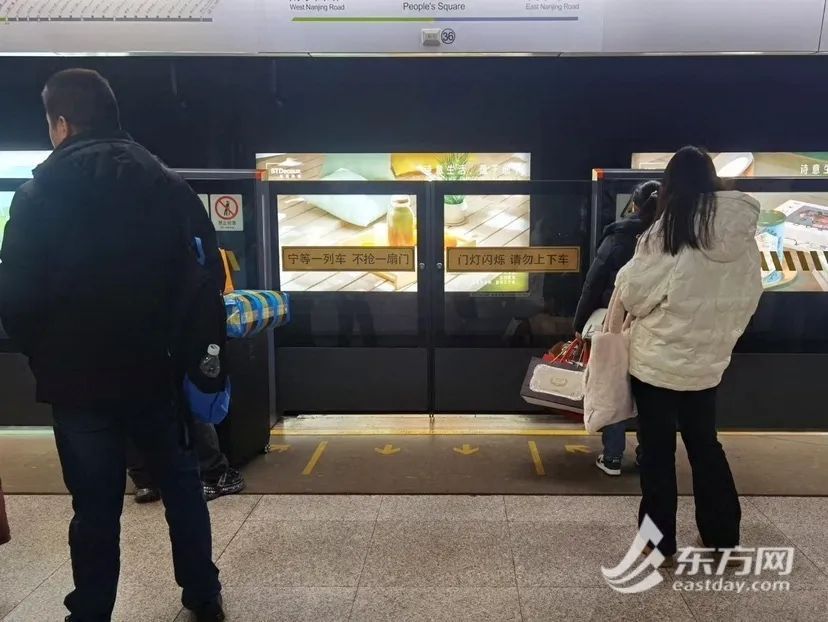 而在一些人流量较大的车站,例如静安寺、世纪大道、人民广场、徐家汇等站的早晚高峰期间,站台工作人员、志愿者仍会人工播报相关提示。但落实到实际的上下车秩序,就只能依靠乘客自觉了。
