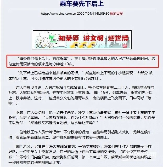 记者注意到2006年曾有报道,上海地铁人民广场站高峰时段“请乘客们先下后上,有序乘车”这句宣传语的播放频率达到每分钟近10次。不过,记者近日随机乘坐上海地铁多条线路时却发现“先下后上”的提示不见了,站台广播只剩下“上下车当心缝隙,请注意脚下安全,门灯闪烁时请勿上下车”。