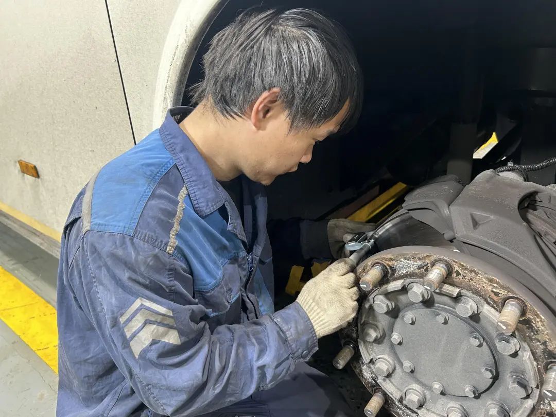 夜班班组骨干人员对春节假期停驶车辆的蓄电池电量、油液渗漏、轮胎胎压及电路系统进行了全面检测,同时排查了车厢内消防设施、安全带、车门应急开关等安全装置,确保车辆从“休眠”状态快速恢复至最佳性能。