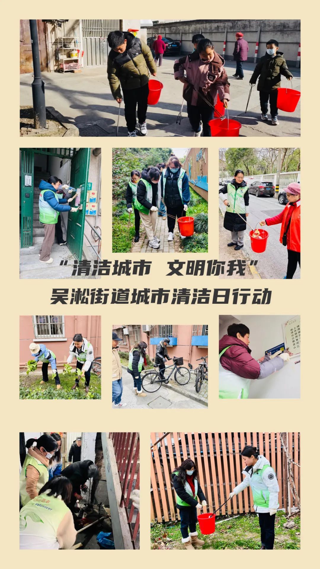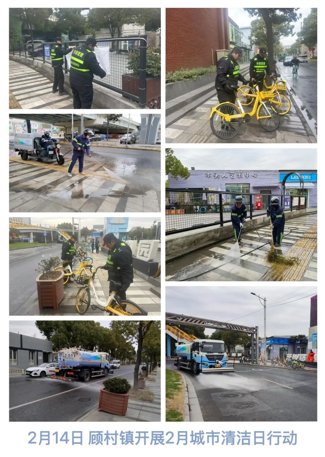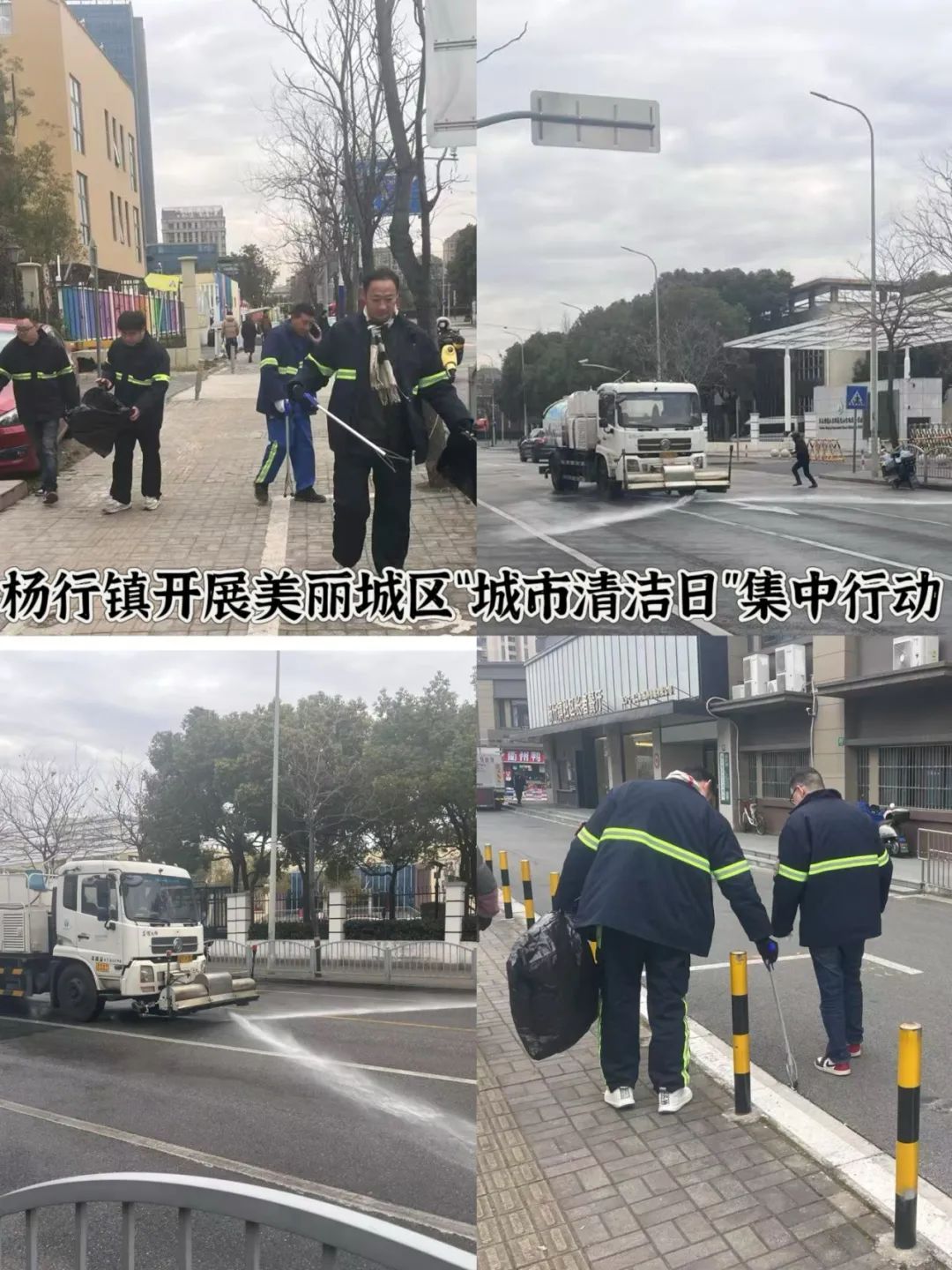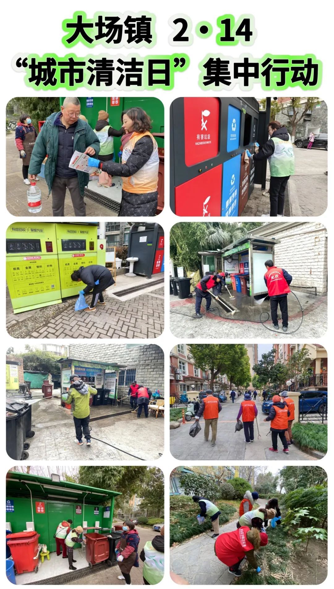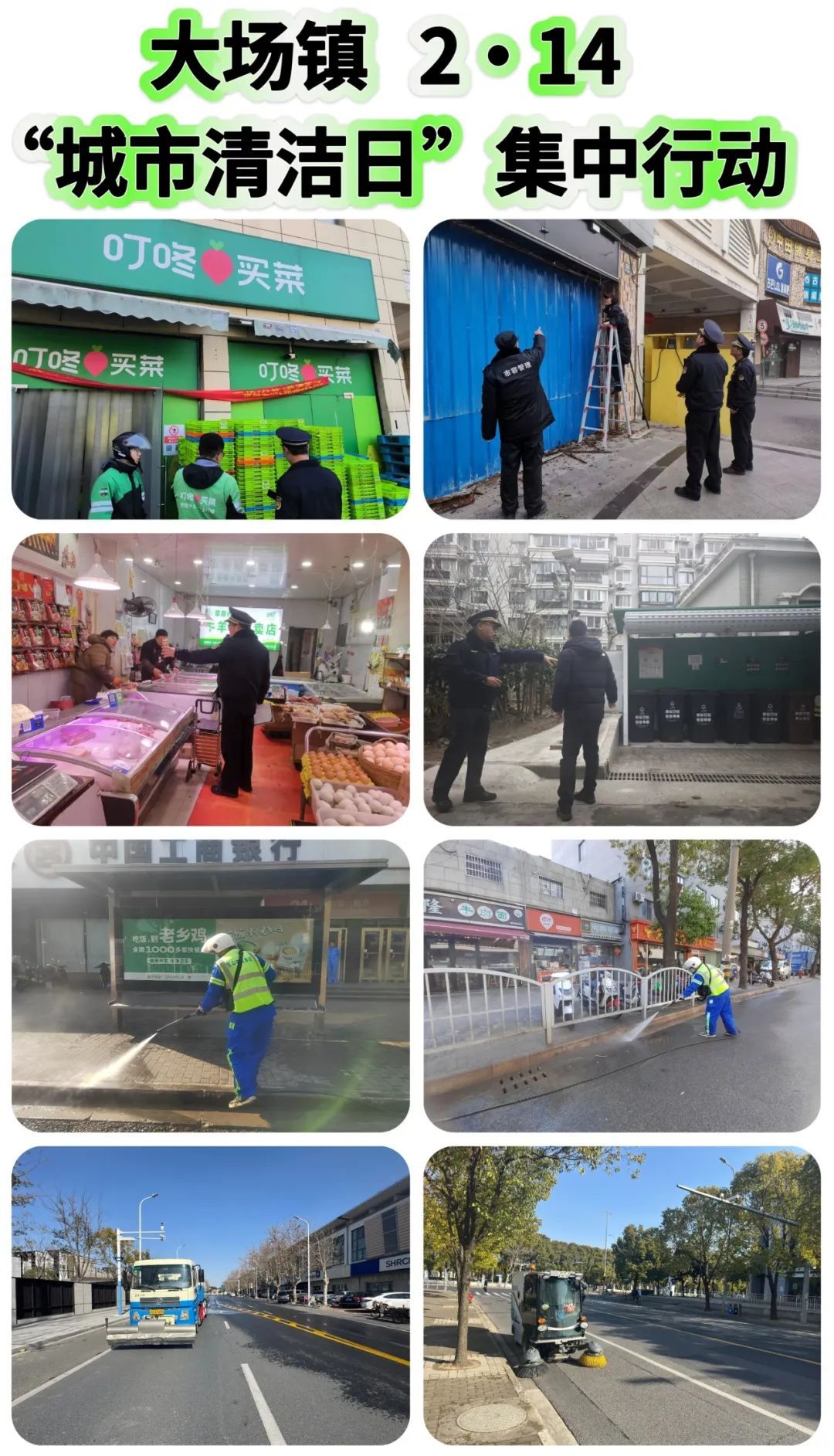 大场镇各居民区居委、物业及志愿者、综合行政执法队员、市政环卫保障力量共同参与“城市清洁日”行动。居民区积极开展小区外环境和楼道清整、垃圾分类宣传等;综合行政执法队检查沿街商户责任区告知书签约情况,督促检查垃圾分类工作,开展门责宣传;市政环卫力量在区域内道路开展深度清洁冲洗和保洁作业,以实际行动扮靓市容市貌,提升街区整洁度和市民满意度,深化美丽和文明城区建设。