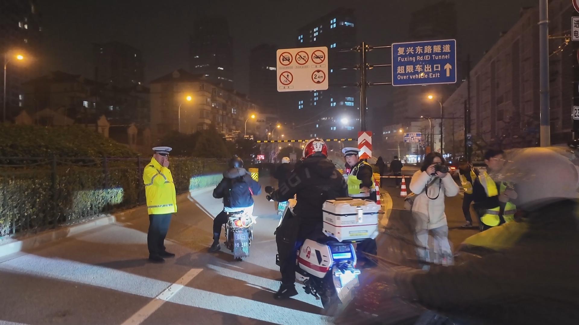 昨晚22点30分,记者来到复兴东路隧道口,目睹了准备工作的有序进行。工作人员用隔离栏将原本通往隧道上层的小型车道入口围起,禁止机动车驶入,同时设置明显标识引导机动车向左行驶进入下层隧道过江。23点整,活动隔离栏被准时打开,配套的交通信号灯也同步启用。每当上层入口处辅道上的红绿灯红灯亮起,辅道的机动车便停下,等待的电动自行车则通过这个口子有序驶入复兴东路上层隧道过江。绿灯亮起时,机动车辆恢复正常行驶,电动自行车则停止等候,整个流程井然有序。