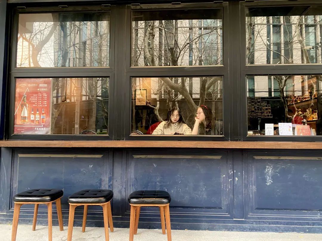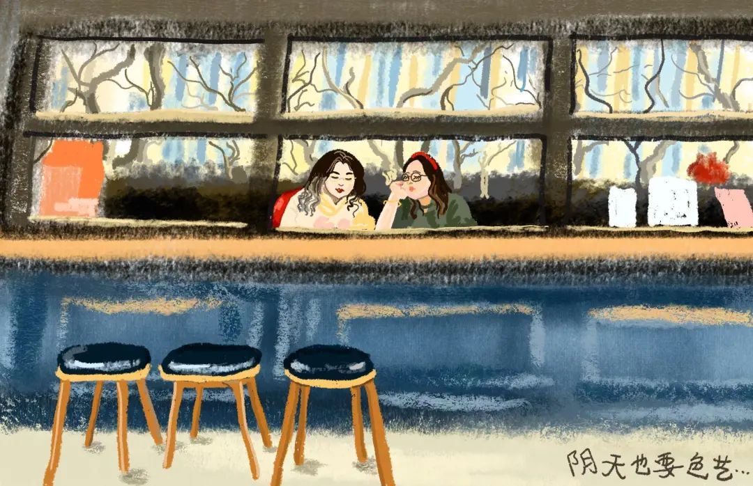 沿街的小酒吧,百无聊赖的下午。在对面梧桐树影映衬下,两个姑娘如猫咪般慵懒地享受午后的时光。