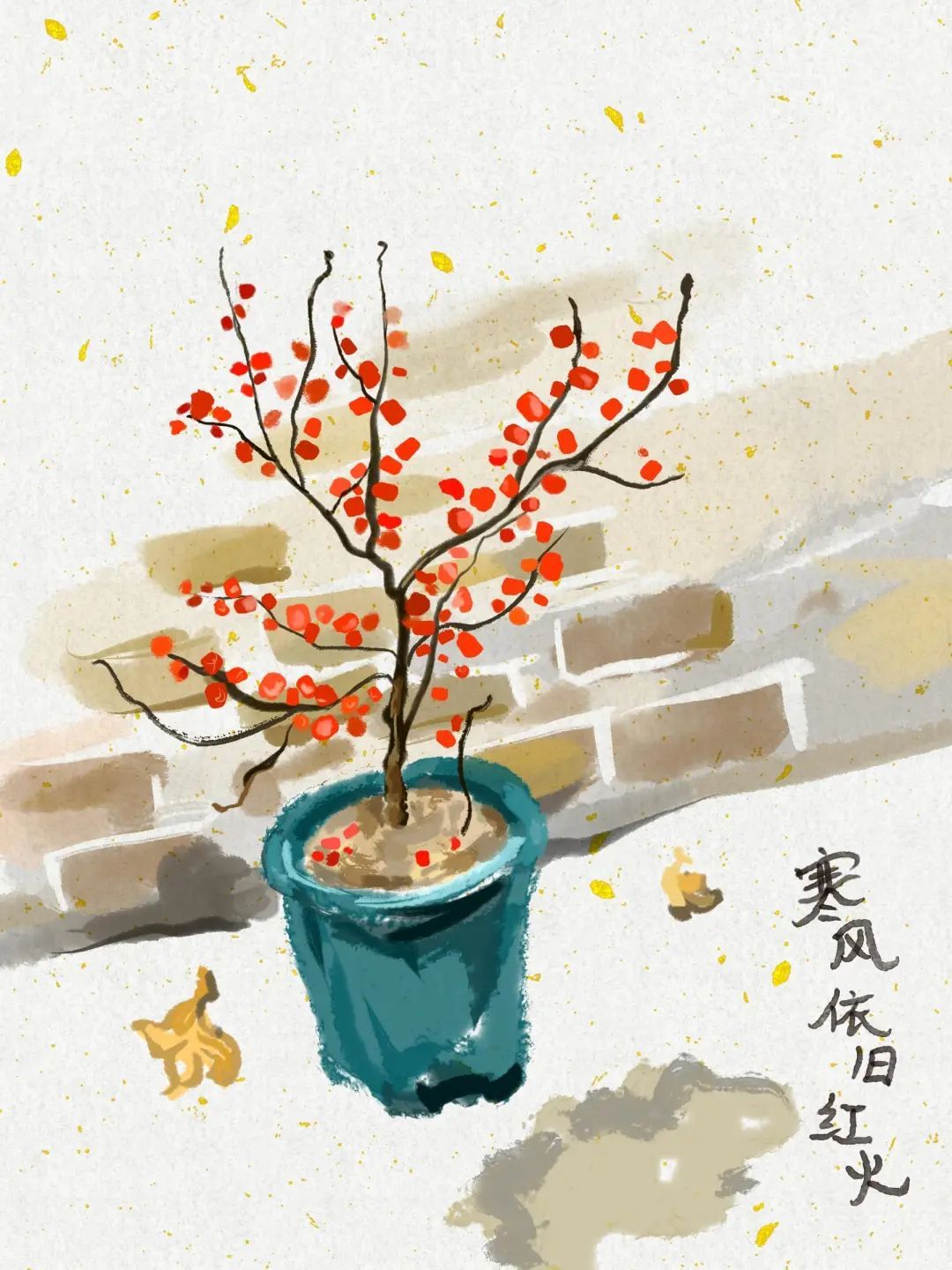 谁家的小院子里摆着的冬青,玲珑如繁星,点点红挂满枝头喜庆异常。它是这个冬天里的最靓的盆栽。