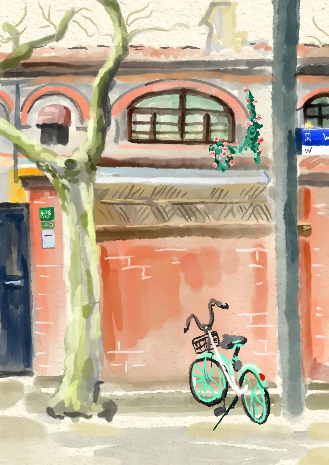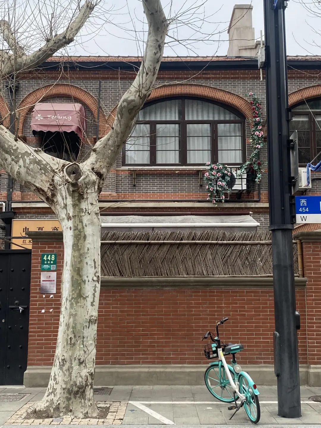 斑驳的树枝还没生发绿叶,自忠路上的篱笆围栏和红墙青砖,窗口的装饰花朵和马路边绿色的自行车相互映衬。
