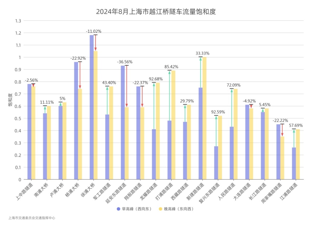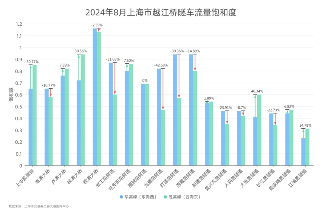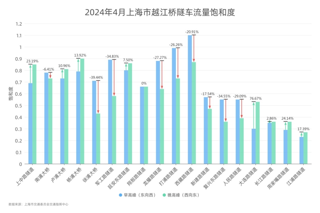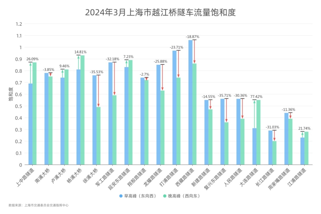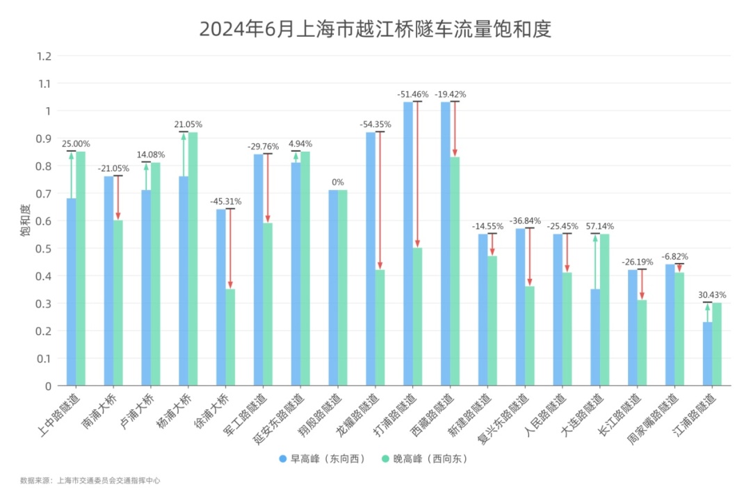 ★西藏路隧道、杨浦大桥和延安东路隧道早、晚高峰流量饱和度都较高,均超过0.8。