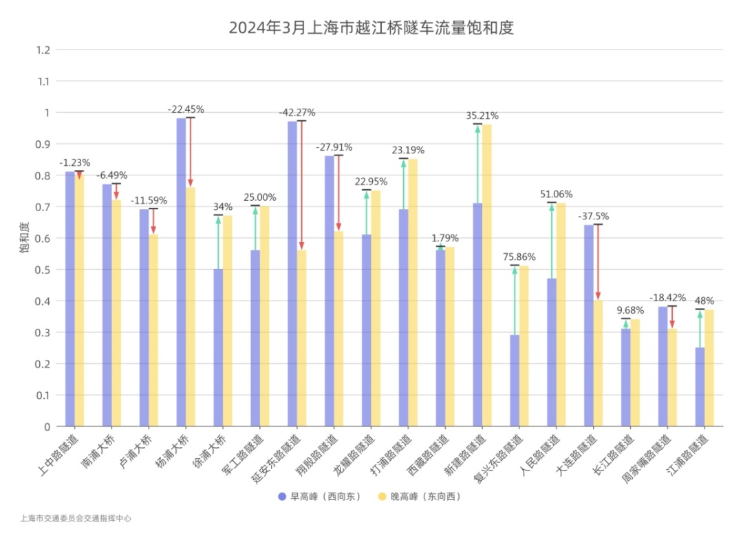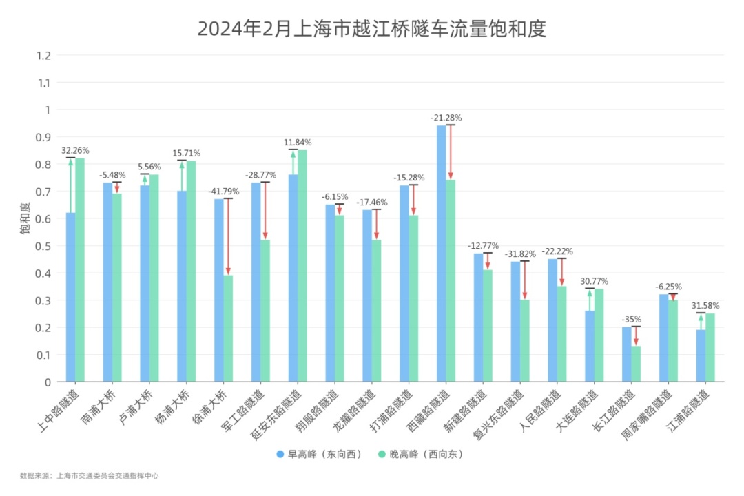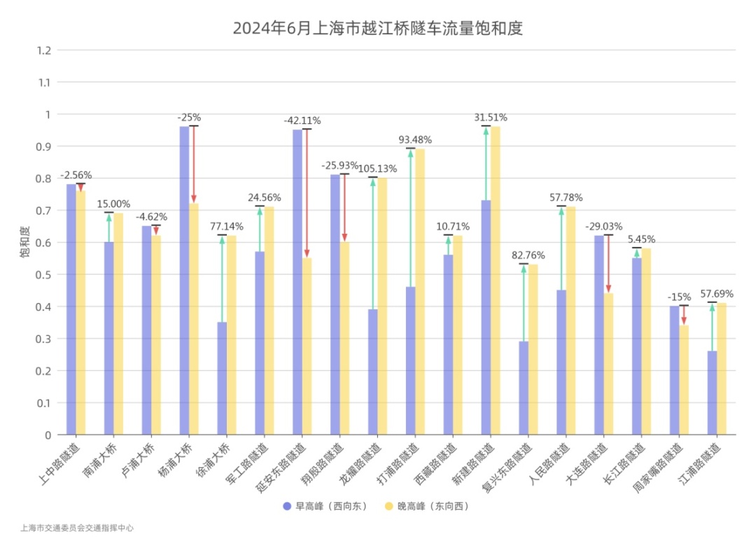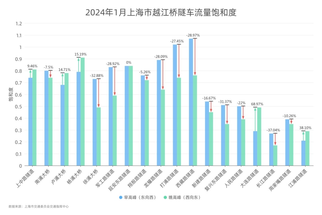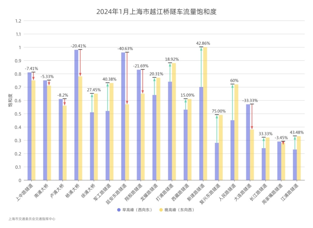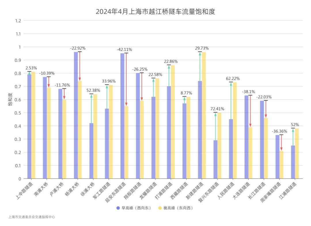 住址与工作地点分隔浦江两岸的朋友们,上下班会选择哪一条越江大桥或隧道通行呢?市交通委指挥中心近日统计推出了2024年工作日越江桥隧“浦东⇄浦西早高峰与晚高峰”各自的饱和度情况,供大家参考。详见↓