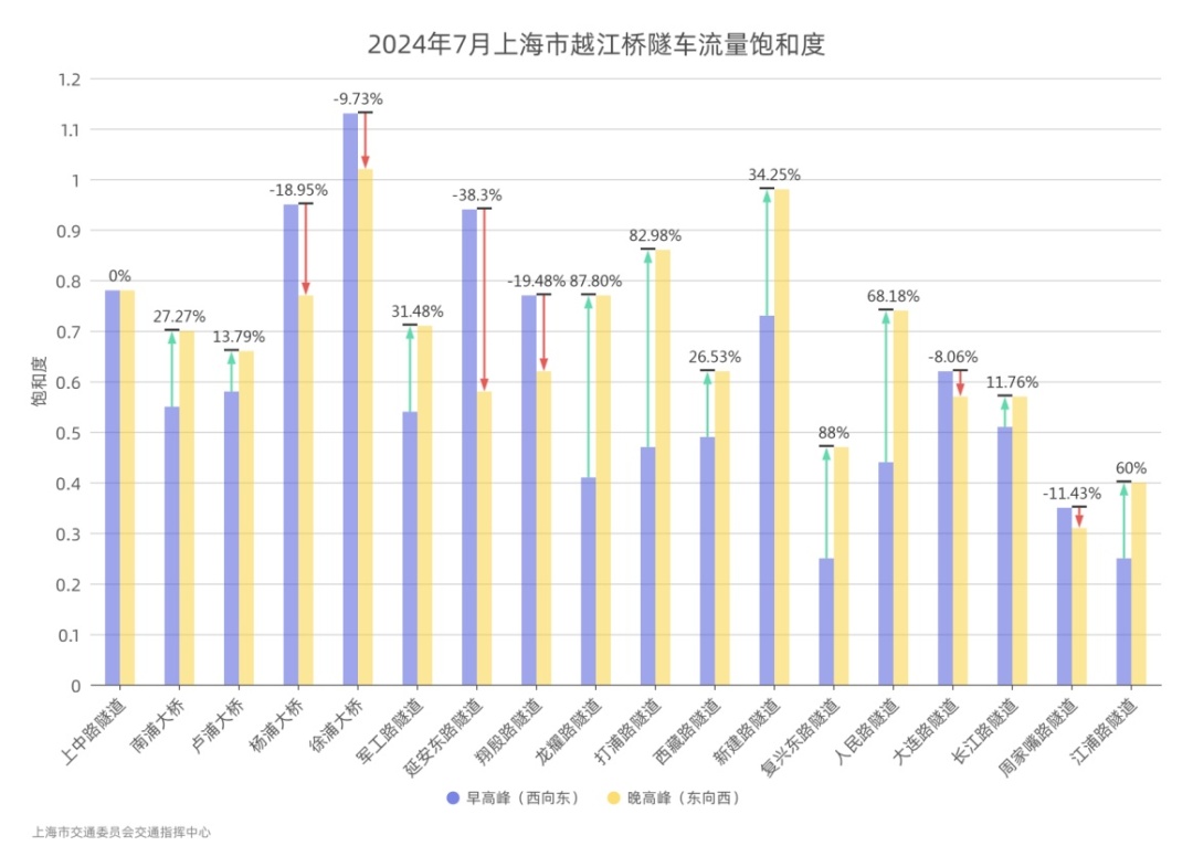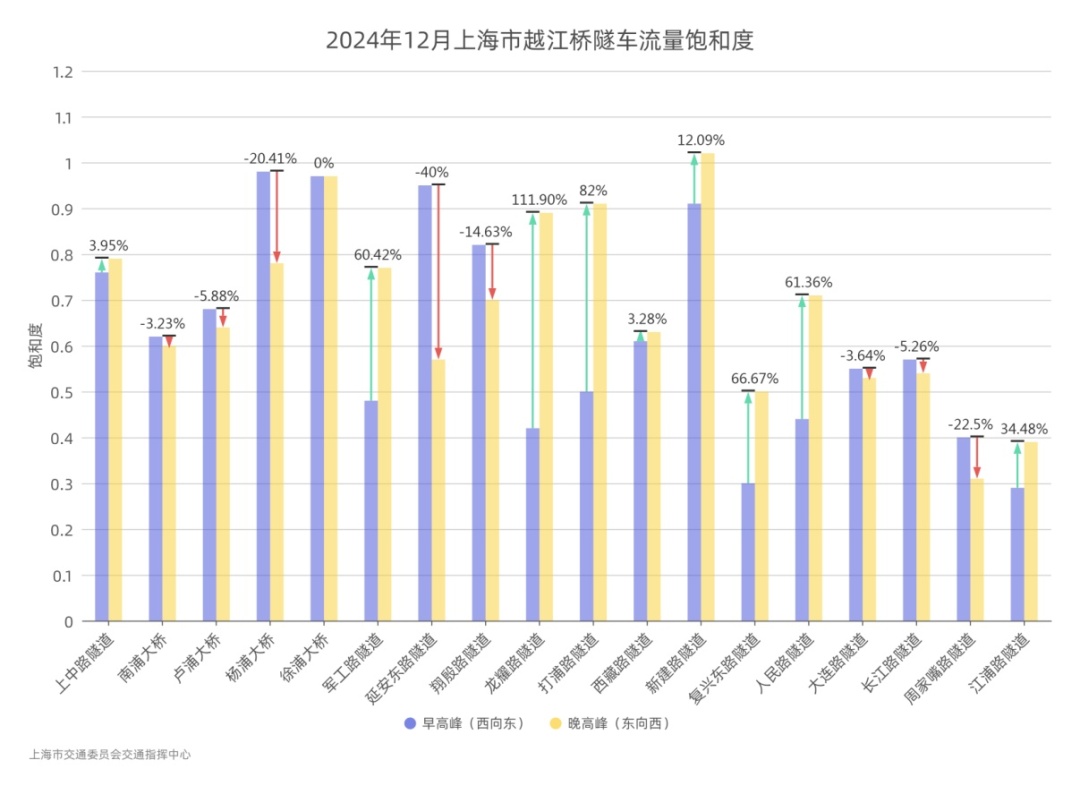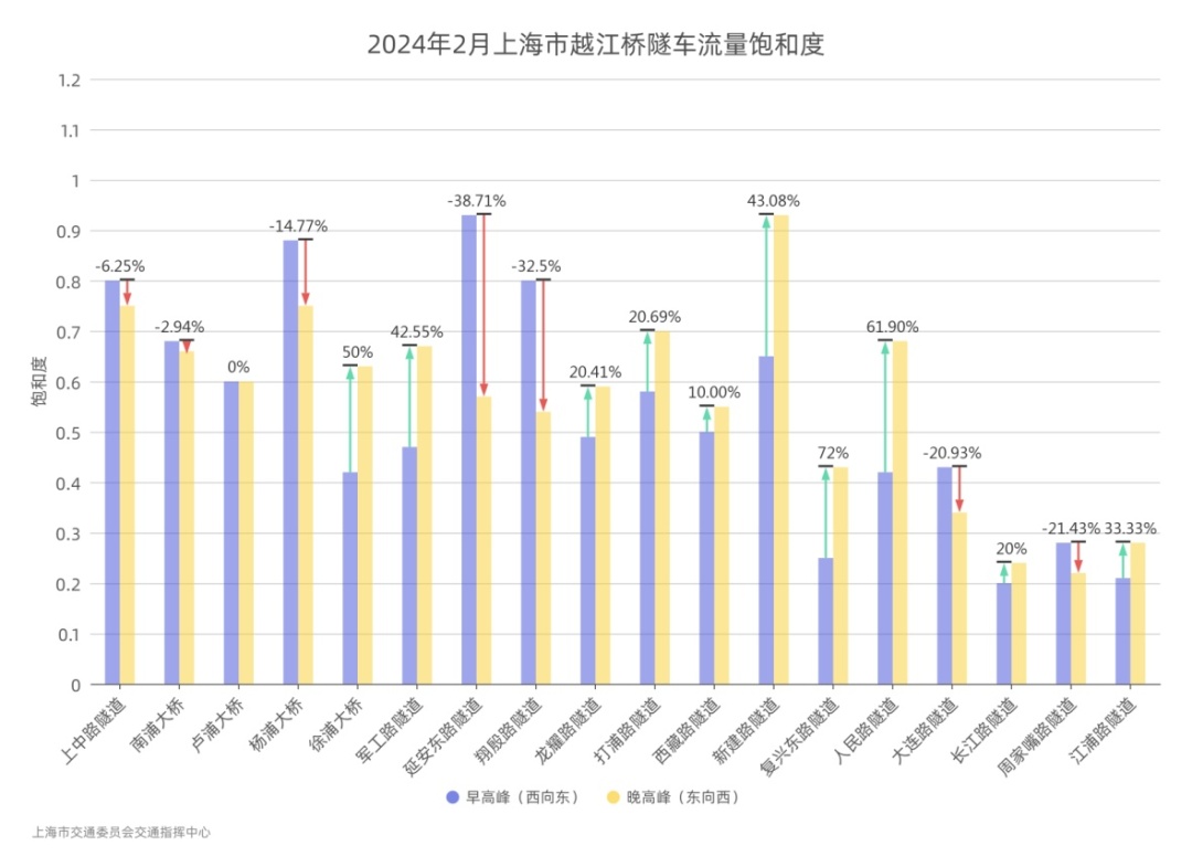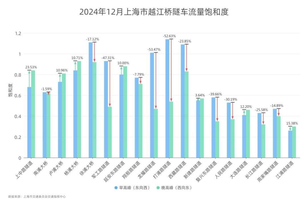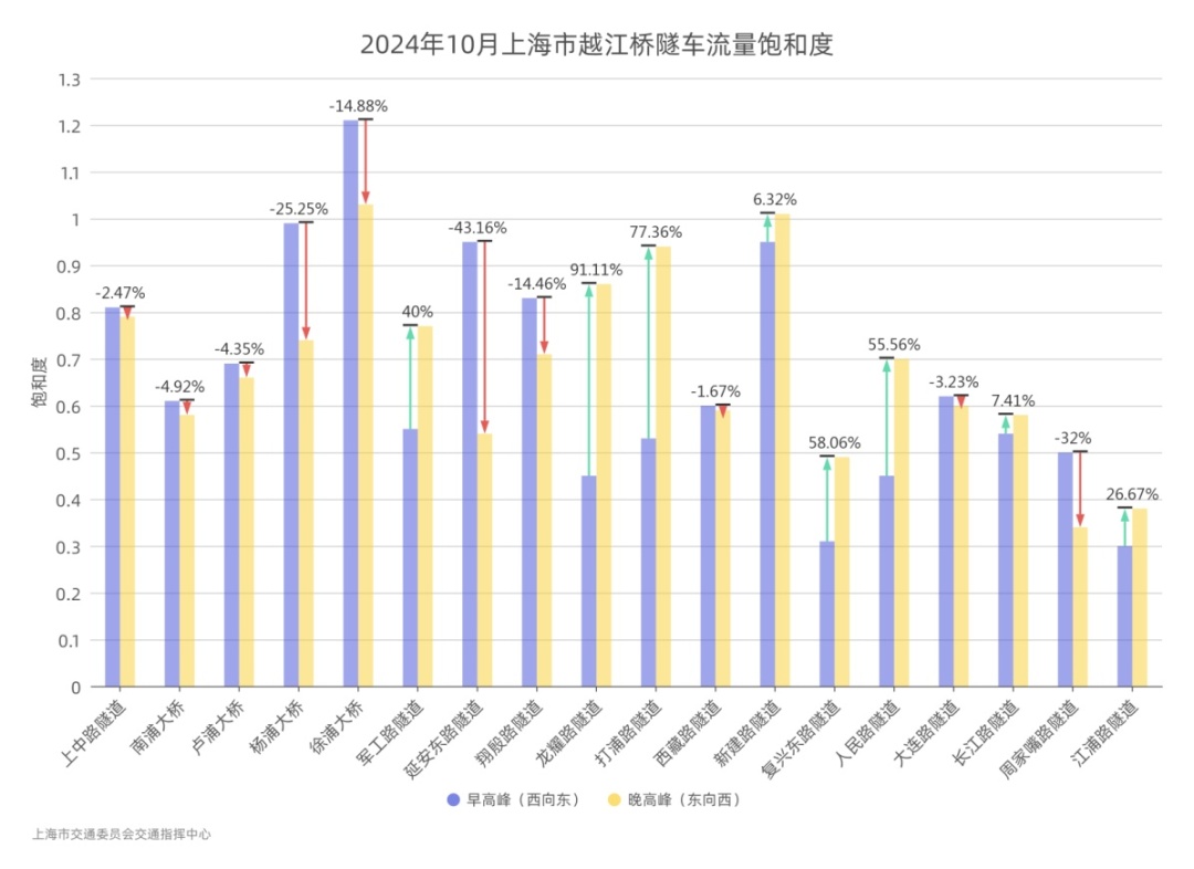住址与工作地点分隔浦江两岸的朋友们,上下班会选择哪一条越江大桥或隧道通行呢?市交通委指挥中心近日统计推出了2024年工作日越江桥隧“浦东⇄浦西早高峰与晚高峰”各自的饱和度情况,供大家参考。详见↓
