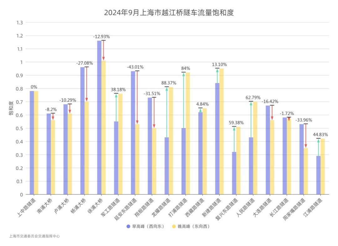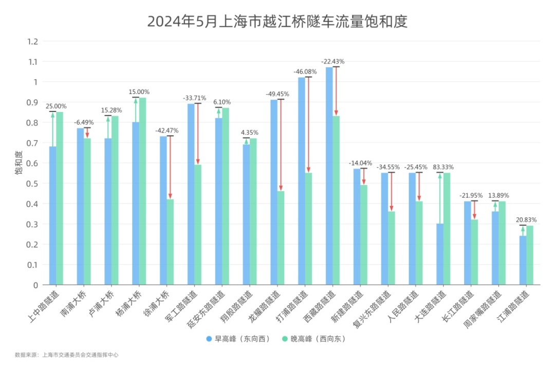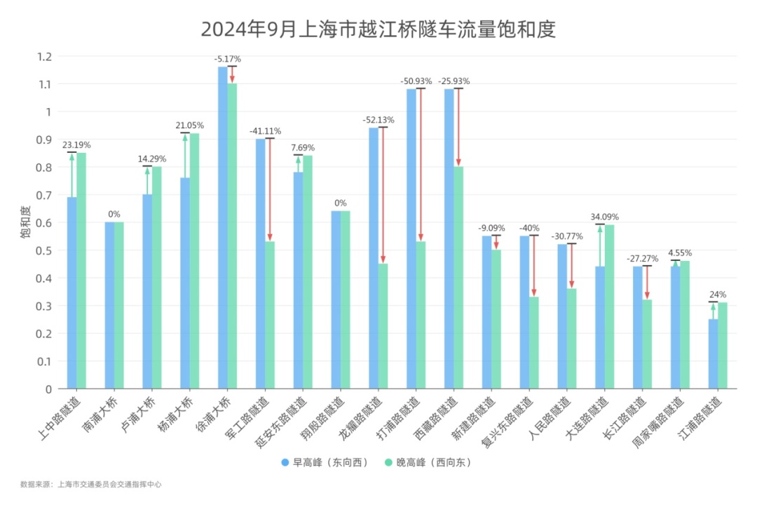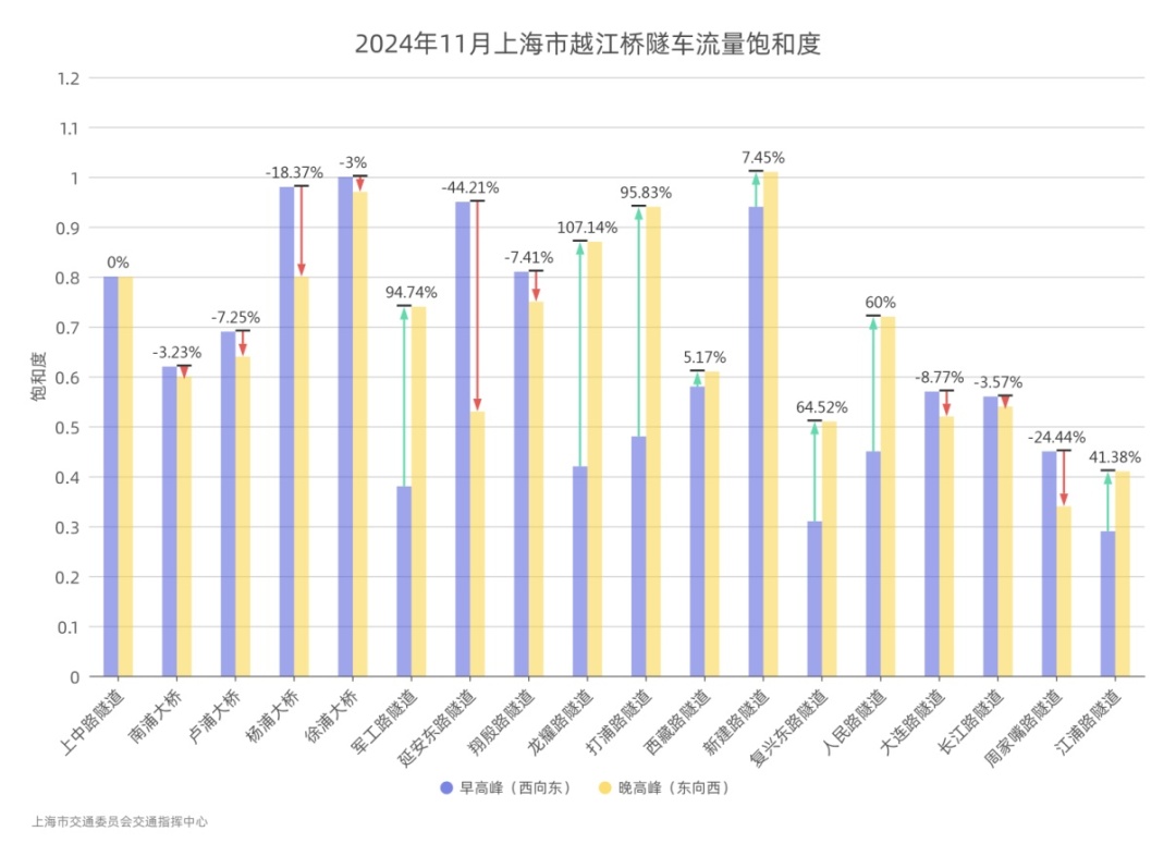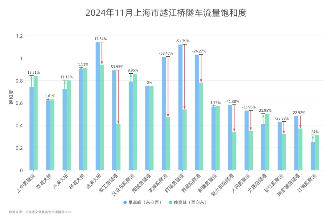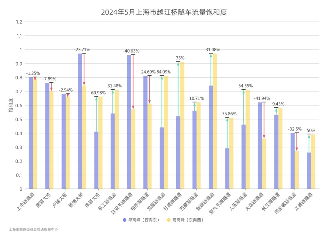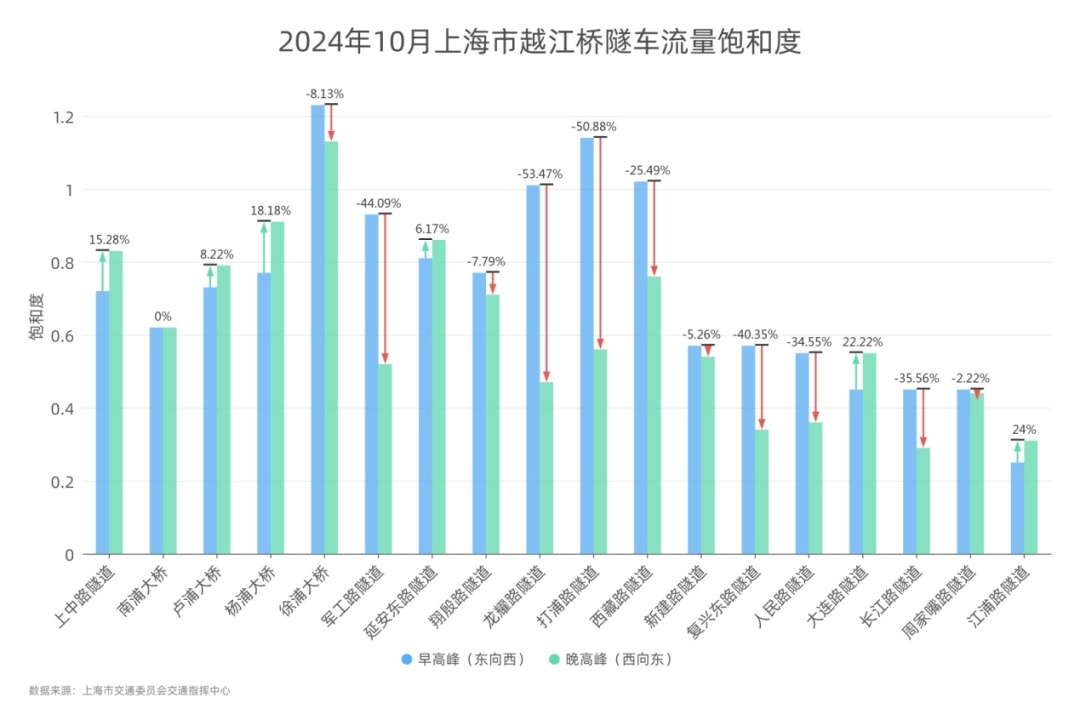 ★杨浦大桥、延安东路隧道早高峰饱和度接近1.0,名列前茅。