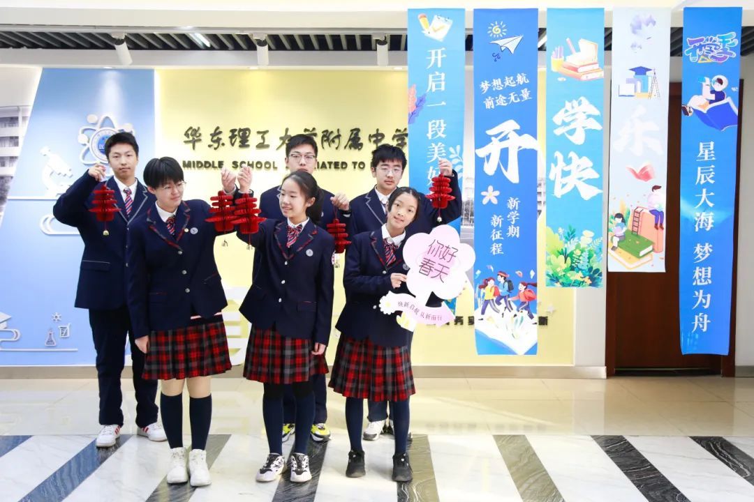 华东理工大学附属中学的校园内外以“你好,春天”为主题,让师生沉浸于春的怀抱中向新而行。每个教室门口悬挂“春”的风铃,发出清脆悦耳的铃声;花坛中一幅幅“春”的画作,点亮开学第一天的好心情;开学第一课上,同学们用《致开学的你》诵出迎接新学期的向往与信心。