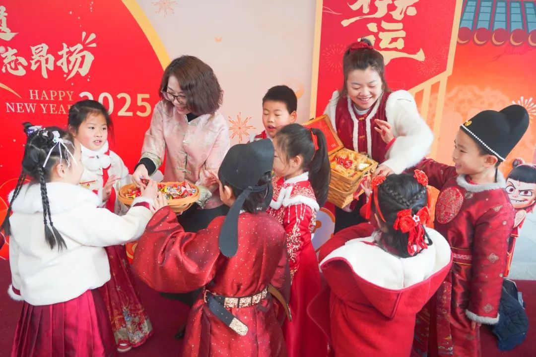 上海市长宁区安顺路幼儿园举行“甜甜蜜蜜大拜年“活动,孩子们身穿喜庆的传统服饰,双手作揖说出吉祥祝福语给老师和同伴们拜年。老师手提福袋,送上糖果与祝愿共庆新年。幼儿园还安排了舞龙狮、猜灯谜等传统体验活动,延续新年里的欢乐,为蛇年新学期注入活力。