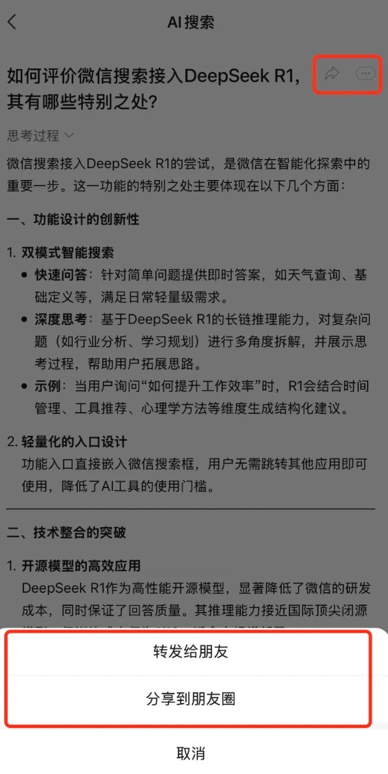 值得一提的是,AI生成的答案页面支持直接转发给好友或分享至朋友圈。