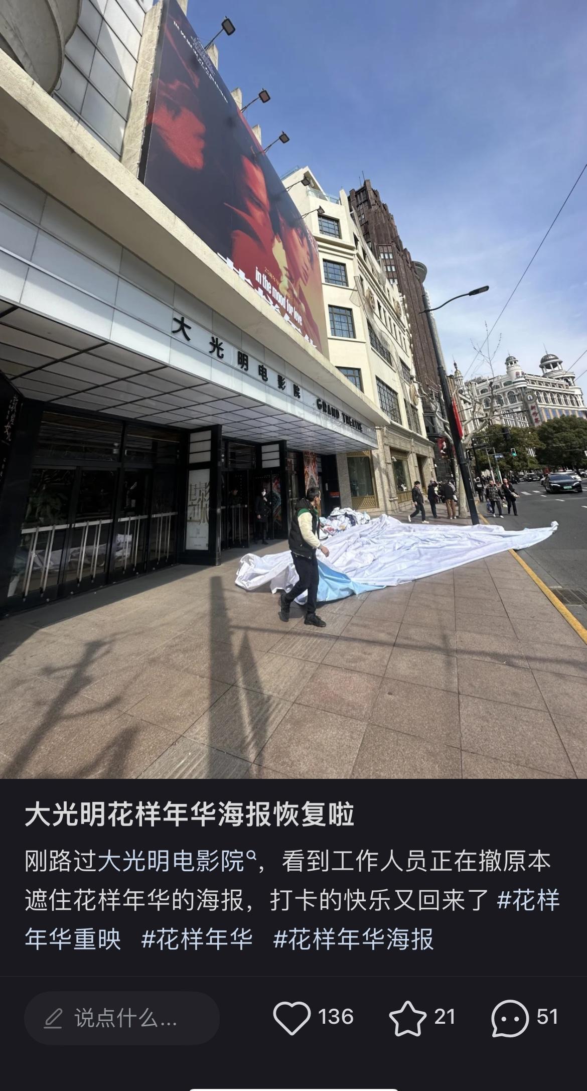 令人欣喜的是,大光明电影院迅速回应了影迷的呼声。2月17日早晨,《花样年华》的巨幅海报重新回归,影迷们纷纷前往打卡拍照,弥补了之前的遗憾。据影院相关负责人透露,这张海报将保留至2月21日12点59分,确保喜欢这部电影的影迷有足够的时间前来合影留念。这一人性化的举措获得了影迷们的一致好评,许多人表示:“影院真的太贴心了,这次一定要拍个够!”