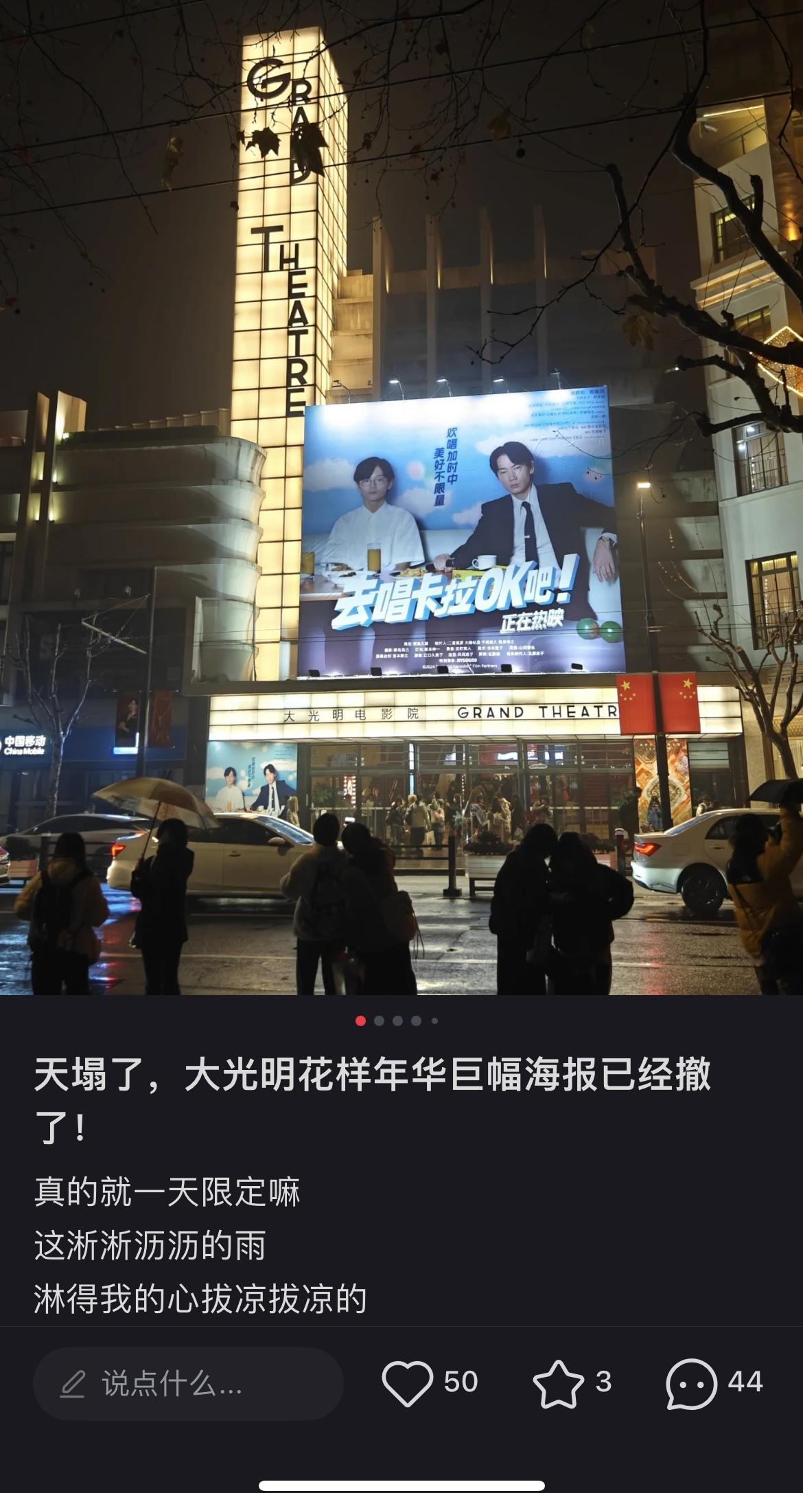 对于喜欢《花样年华》的影迷来说,这张海报不仅是一张宣传画,更是一种情怀的象征。它承载着对电影的喜爱,也寄托着对那个年代的怀念。如今,海报的回归让大光明电影院再次成为了热门打卡地,许多影迷甚至从外地专程赶来,只为与这张海报合影留念。如果你也是《花样年华》的粉丝,或者想感受一下这份独特的情怀,不妨趁海报展示的最后几天,前往大光明电影院打卡拍照。毕竟,经典不会永远停留,但美好的记忆可以永远留存。