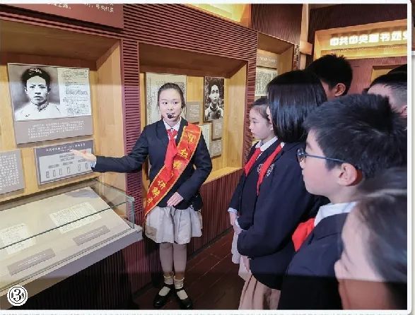 中共中央秘书处机关旧址纪念馆首次在场馆内使用青少年版讲解词,“小红苗”红领巾讲解员带领同学们参观。(叶辰亮 摄)