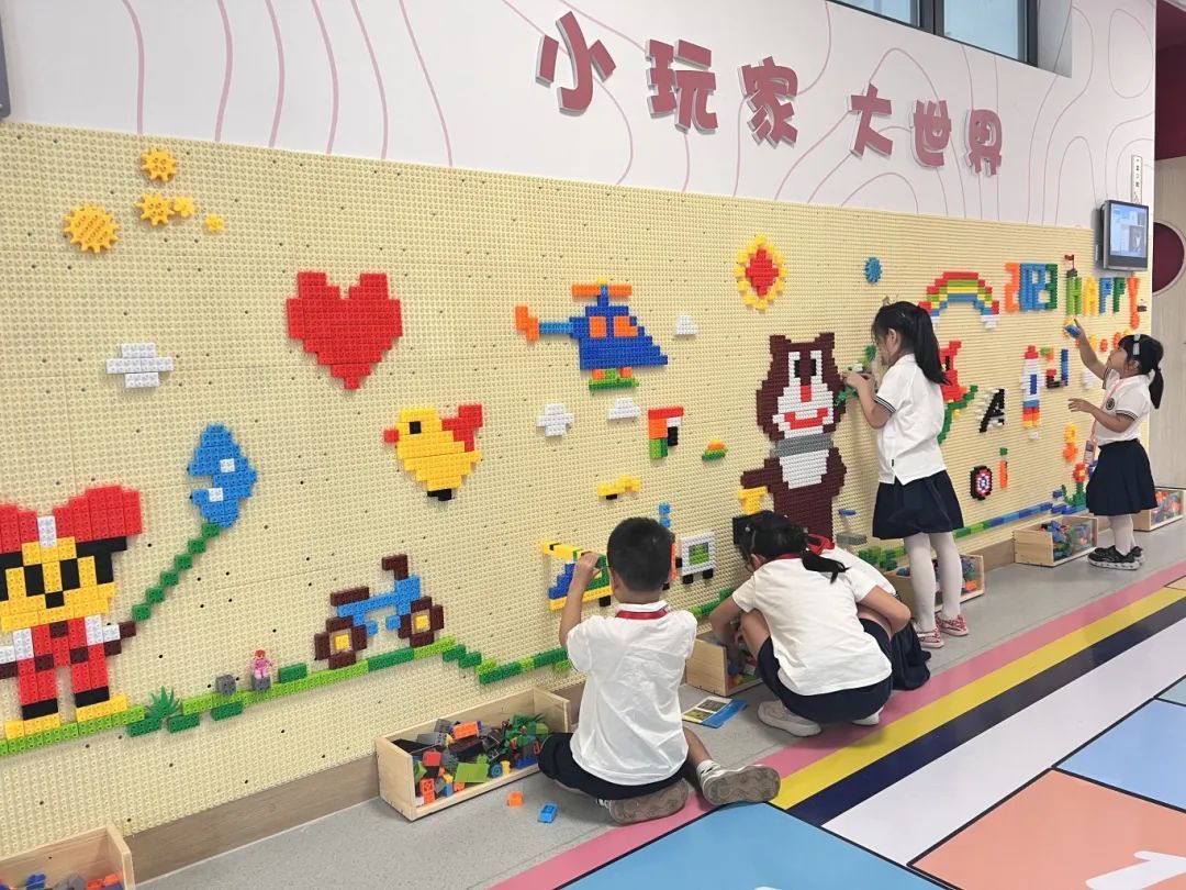 学校利用教室走廊打造了“儿童友好墙”,展示孩子们的笑脸和学校近年来开展的人文活动,让笑脸点亮校园,让缤纷进驻童心。“实践中成长,快乐中绽放”的作品展示墙、“跟着课本去旅行” 带着孩子们寻找课本里的诗与远方、“小玩家、大世界” 乐高拼搭锻炼了思维能力和动手能力、“成长与科学相遇” 动手操作科学小摆件等内容,供孩子们课间自由选择活动。