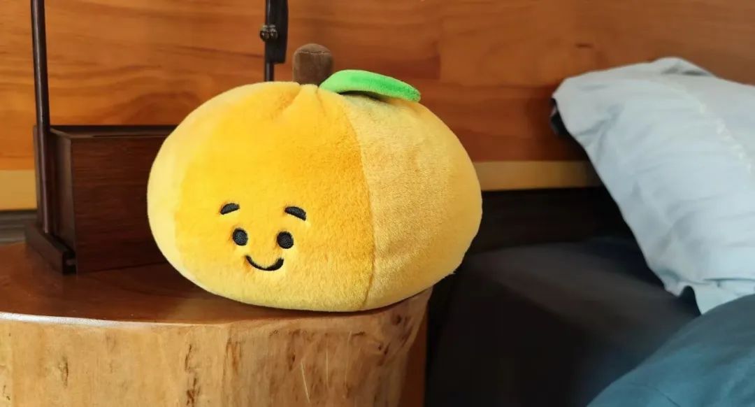 民宿共设计为7个独具特色的房间,包括亲子复式套房、温馨大床房、星空主题套房等,最大程度满足了各类居住人群的需求。不同房间以“红美人”“千金桔”“长红橘”“锦橙”等柑橘品种命名,并配上文字介绍,住客进门时一眼就能看见并记住。走进房间,可以看到内部装饰大量运用了原木色,且没有过多的装饰和复杂的细节,原木切割的凳子、竹编榻榻米、各种木质小饰品,无不营造出宁静和谐的氛围。房间内还有各种柑橘元素的装饰品,与原木的装修色调搭配在一起显得异常和谐。