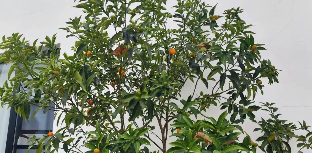 驱车前往月心湾民宿,道路两旁的田间随处可见挂满金黄果实的橘子树,农家房屋错落有致,烟火气十足。