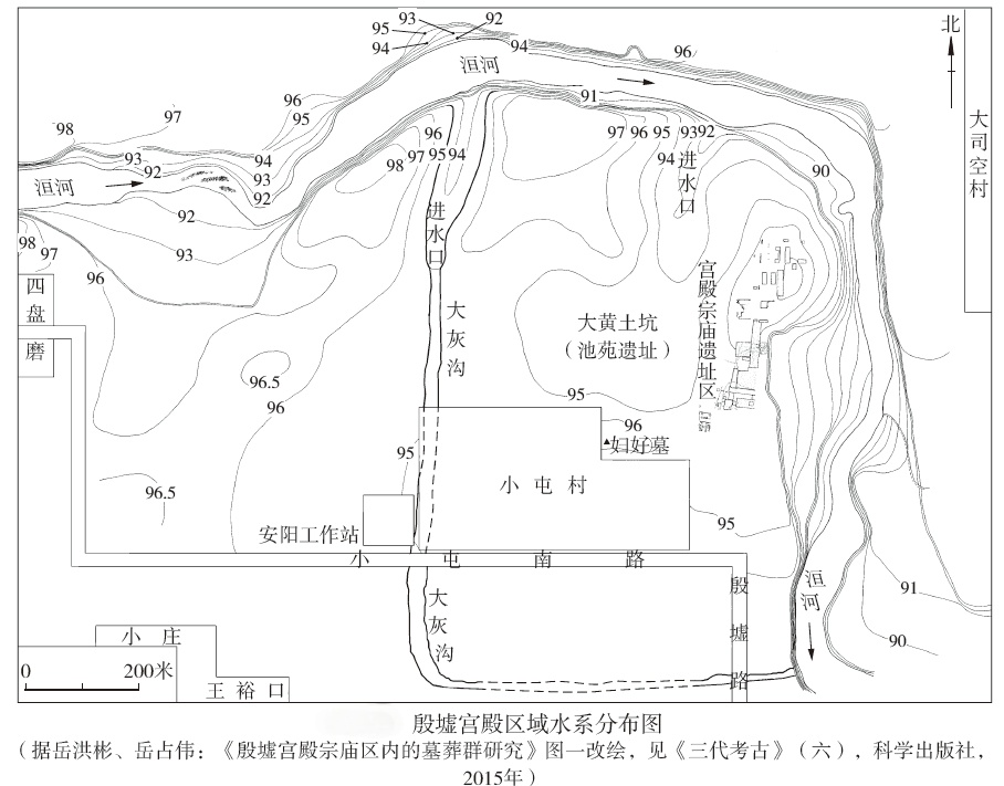 在殷墟遗址小屯宫殿宗庙区,发现有面积不小于4.5万平方米的大池子,这是池苑的遗存。池子东北部向北伸出一条水道,直通洹河南缘构成排水通道,还具备了排水及蓄水的功能。