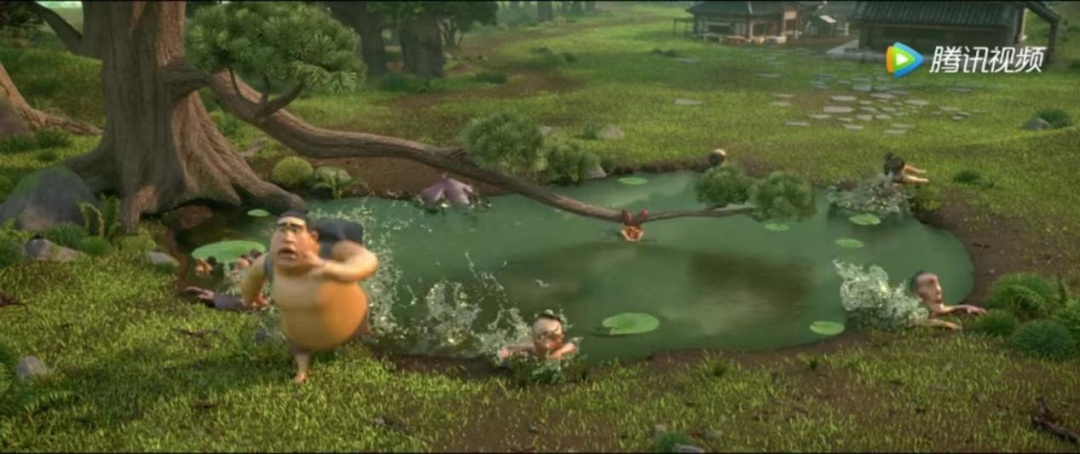 两部电影《哪吒》中,不仅有李府的景观水池,也有人们为躲避哪吒而藏身的水池,还出现了种植莲藕的池塘,这种陂塘元素的加入,也与商代考古发现能够吻合。