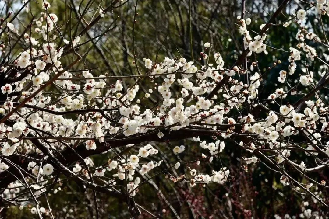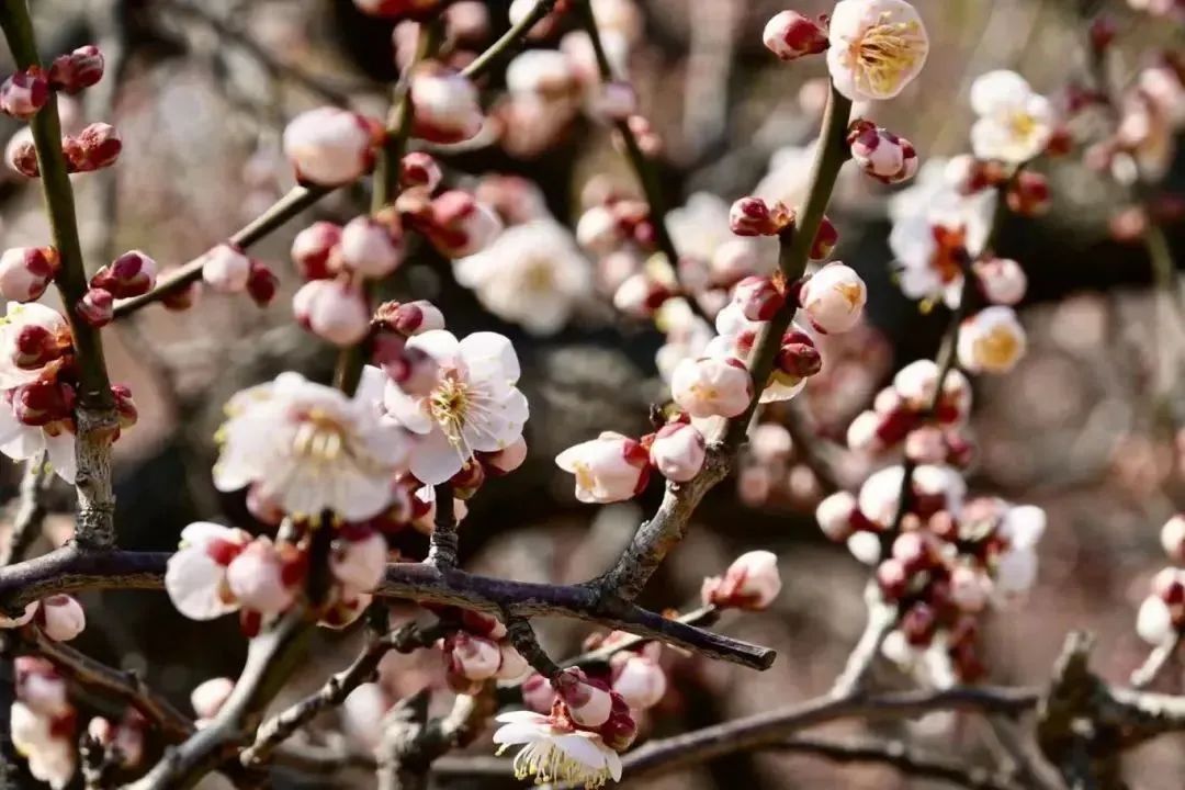 世纪公园内,梅花正逐渐绽放,使得原本光秃秃的枝头一时间变得春意盎然。