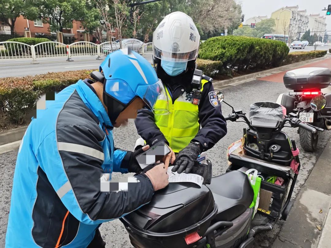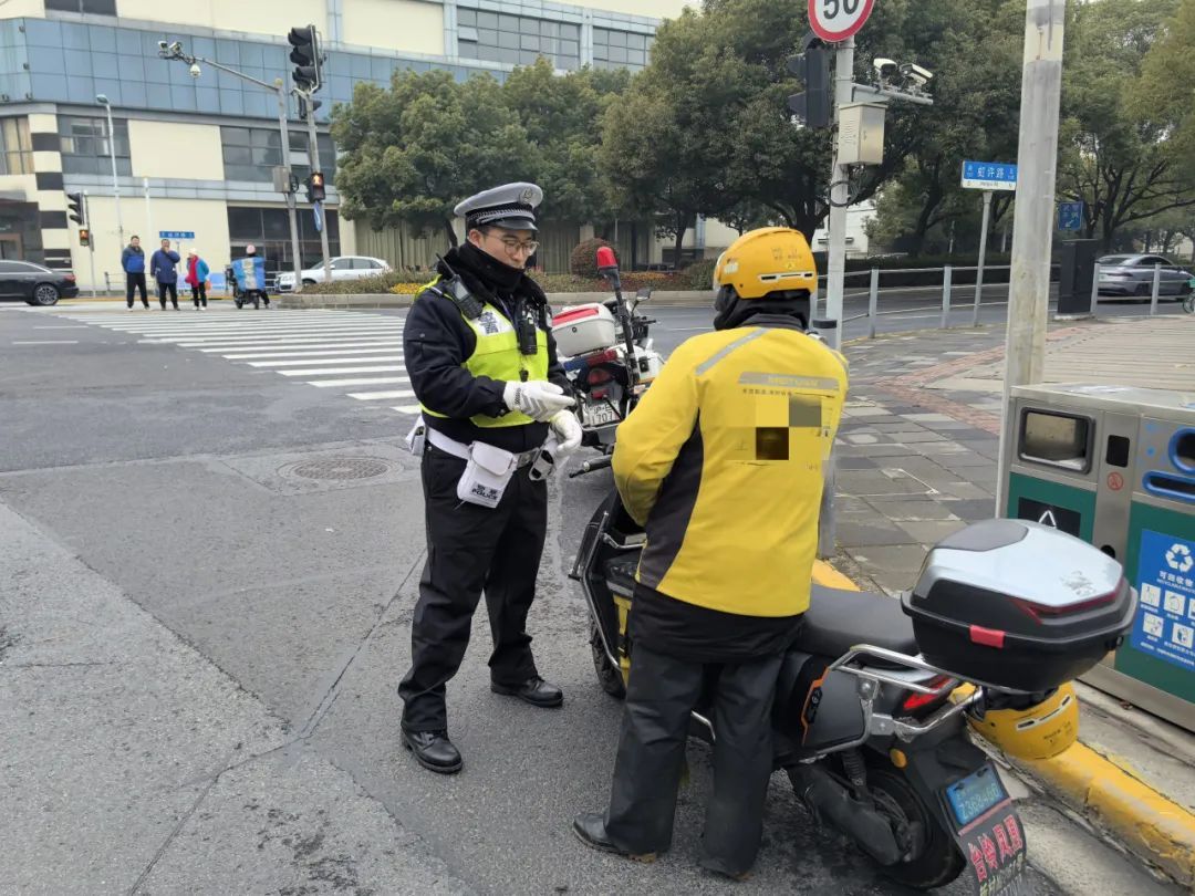 近日的中午时分,在仙霞路哈密路路口,民警拦停了一辆外卖车辆,对当事人张某某实施驾驶非机动车违反交通信号灯指示的违法行为,处以50元罚款,并开展普法教育。