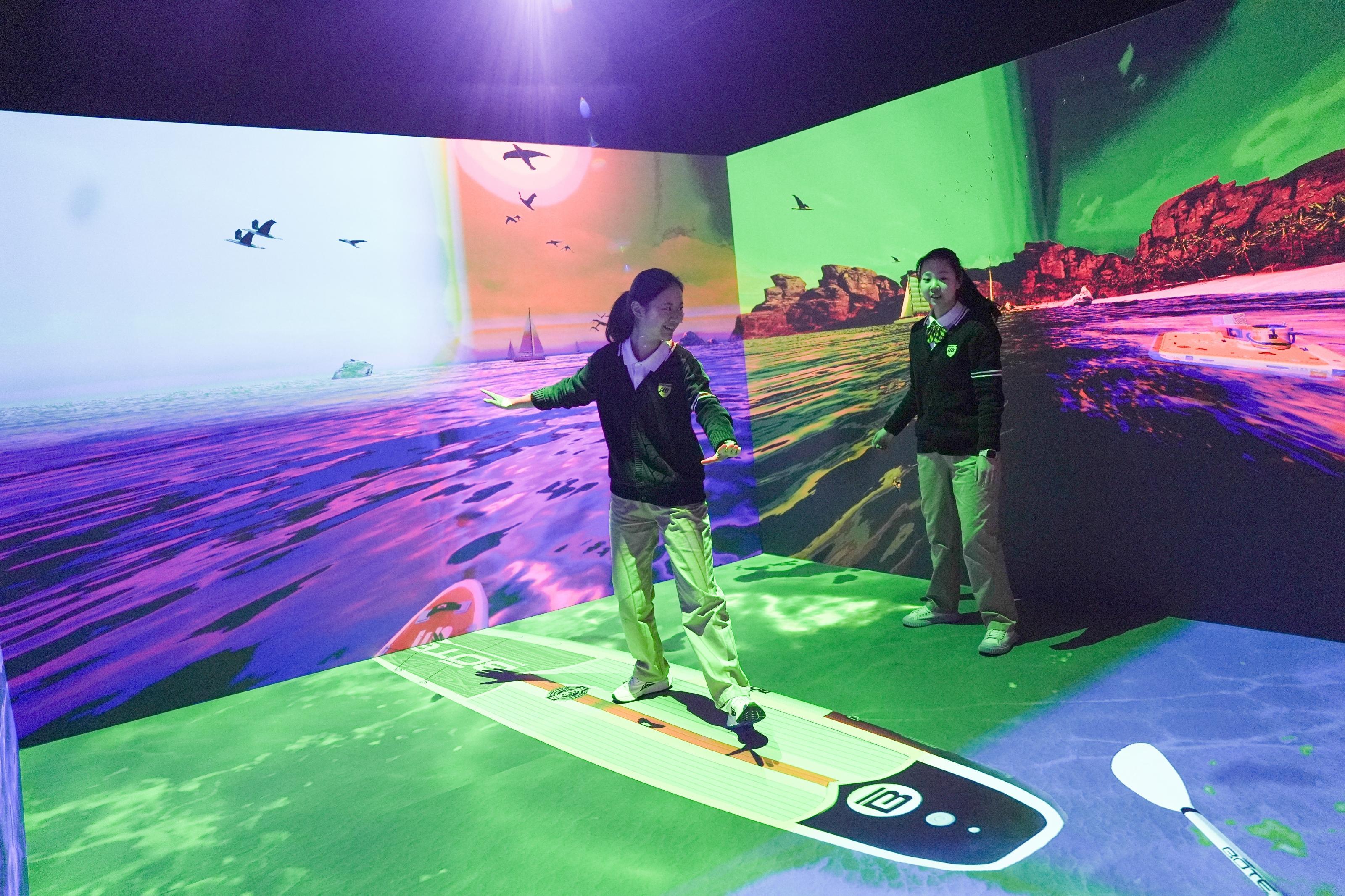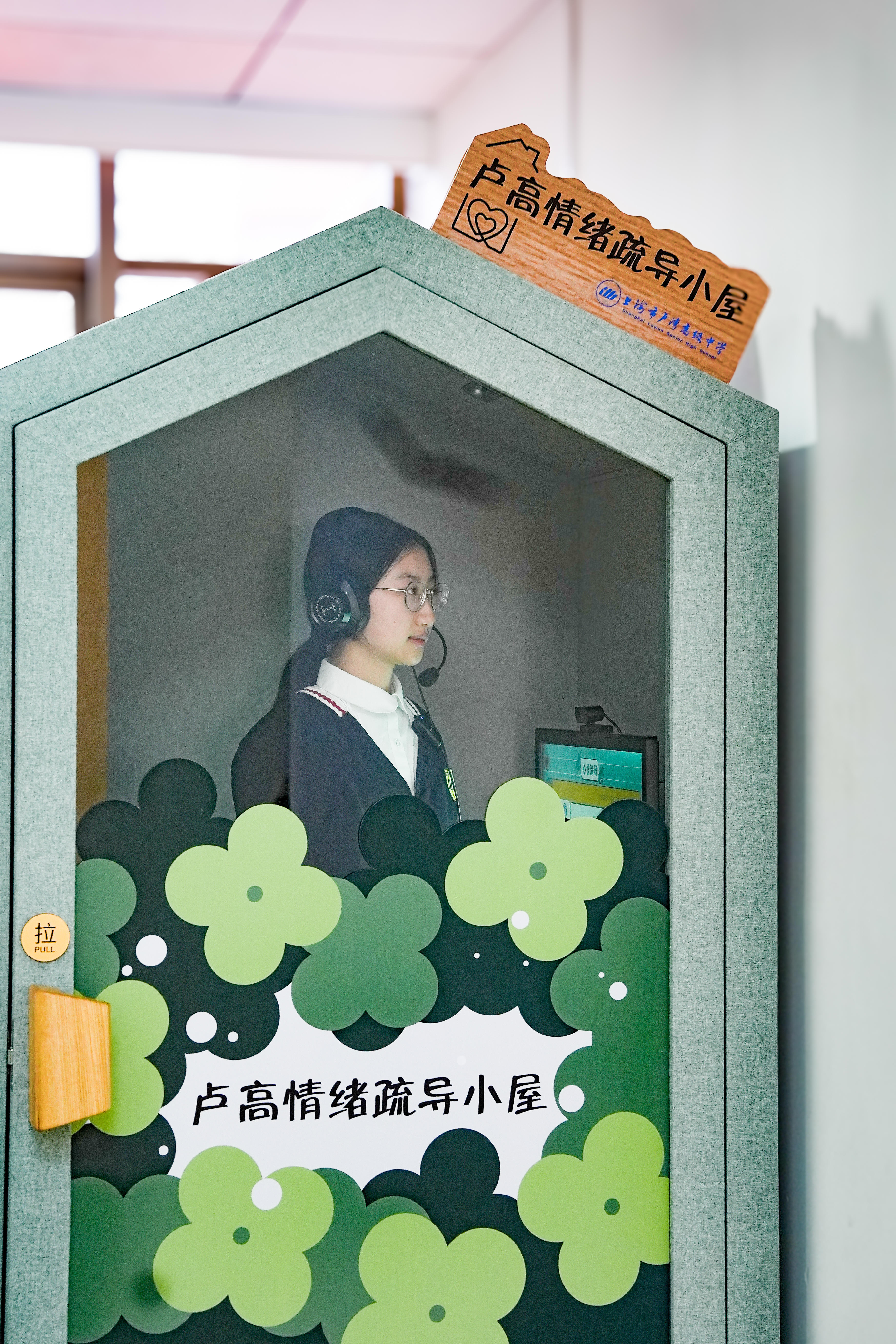 作为全国中小学心理健康教育特色学校,卢湾高级中学承担着上海教师心理健康发展服务中心、黄浦区未成年人心理健康辅导中心和黄浦区未成年人家庭教育指导中心的功能。有了人工智能技术的加持,心理教师刘金艳感到在工作中更有力有效了:全景式投影下,学生可以模拟在大海冲浪、森林漫步、溪边小憩,沉浸式地冥想放松、舒缓身心;刘老师还鼓励学生尝试在个别咨询室向机器人倾吐心事,没准还能收获ta鼓励的牵手和拥抱;新落成的情绪疏导小屋也成了她工作上的好帮手,学生戴上耳机,可以进行趣味情绪宣泄和心情涂鸦……