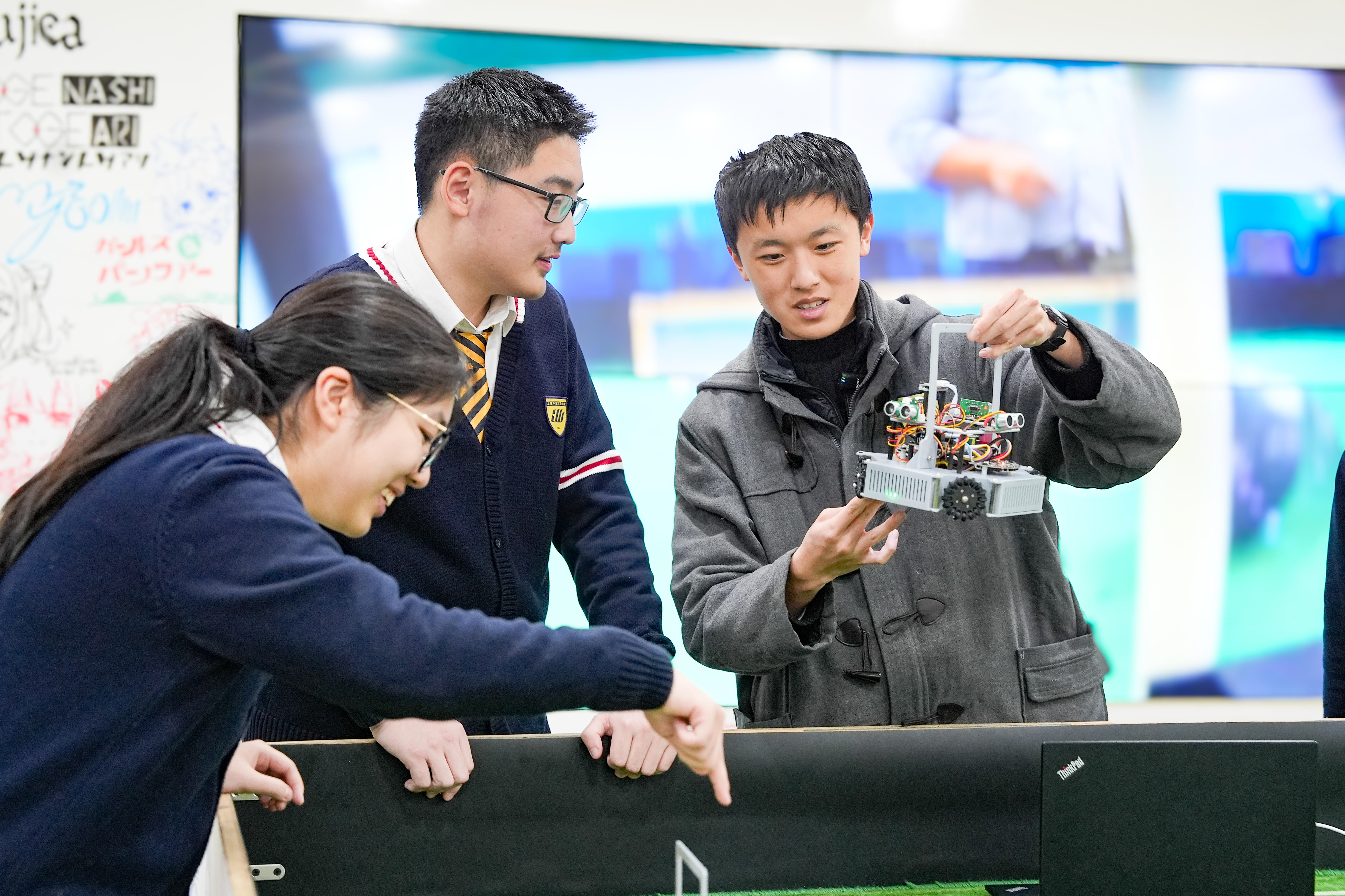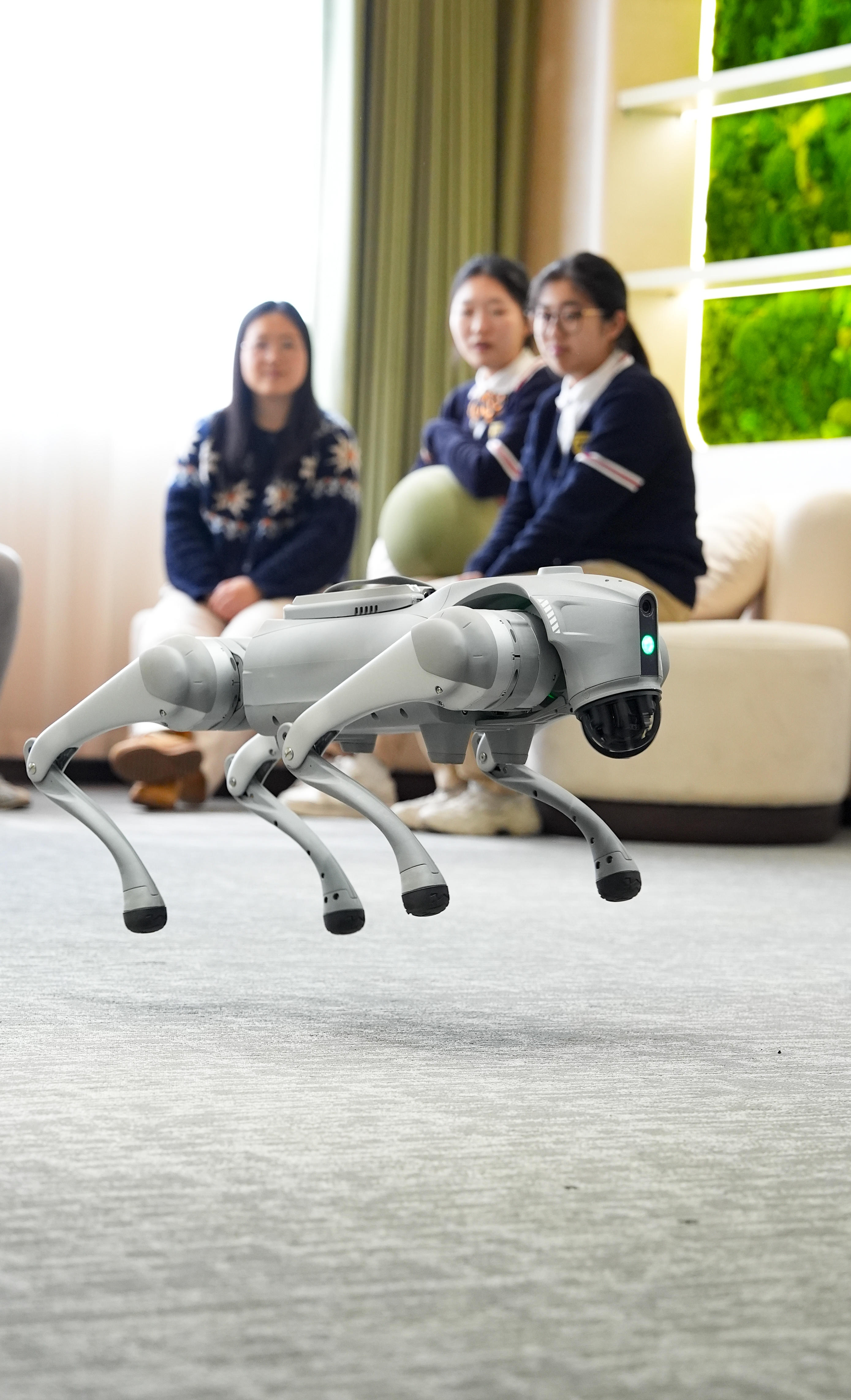 “走,上九楼!”无人机、机械臂、机甲大师、智能救援……日复一日,人工智能实验区吸引了许许多多对科创有着浓厚兴趣的学生。除了“立芯·展翼”,教学楼的其他楼面也注入了丰富的人工智能元素:六楼的校图书馆,智能机器人正协助师生精准定位查找书刊;位于七楼的心理健康中心,一只来自“宇树科技”的机器狗跳起舞来令人忍俊不禁,大眼睛机器人善于倾听,共情人类的烦恼甚至给予一个安慰的拥抱;在配备AR虚拟化学实验功能的十楼理化实验区,学生戴上VR眼镜与化工厂实时连线,更直观地理解抽象难懂的理化知识;十一楼的未来学习中心全新亮相,等待着更多“部落”成员前来体验……
