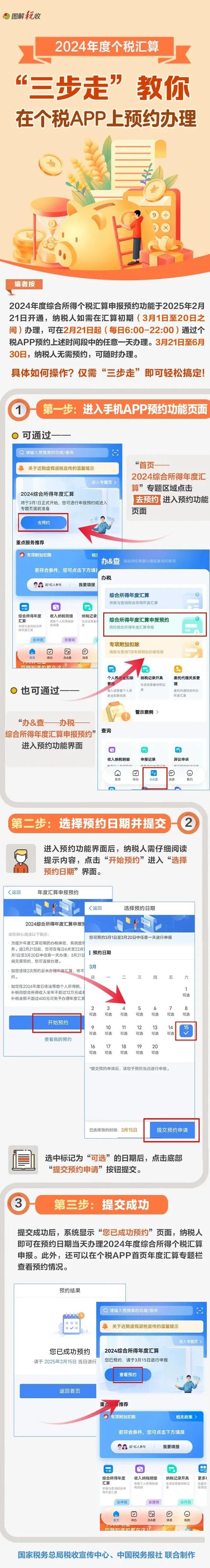 2025年3月1日起,2024年度个税汇算正式开始。明天(2月21日)起,可预约办理年度汇算。如何预约?哪些人需要办理?来看新华社、市税务局的操作指南↓
