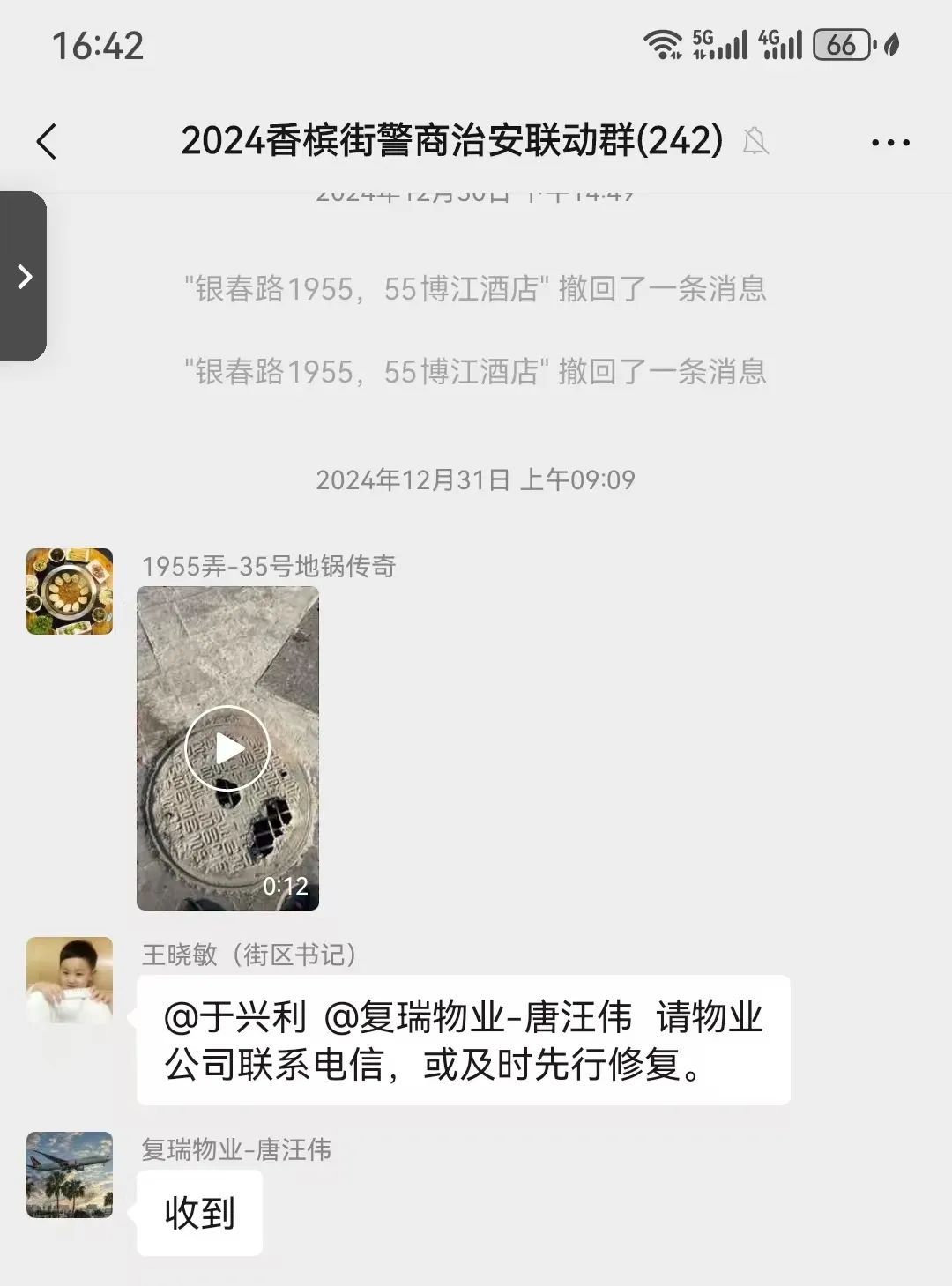 “您好,门口窨井盖出现破损,希望能够尽快维修。”日前,位于银春街区的香槟坊的地锅传奇商户通过微信群,向街区书记反映店铺门口窨井盖出现破损,存在安全隐患。