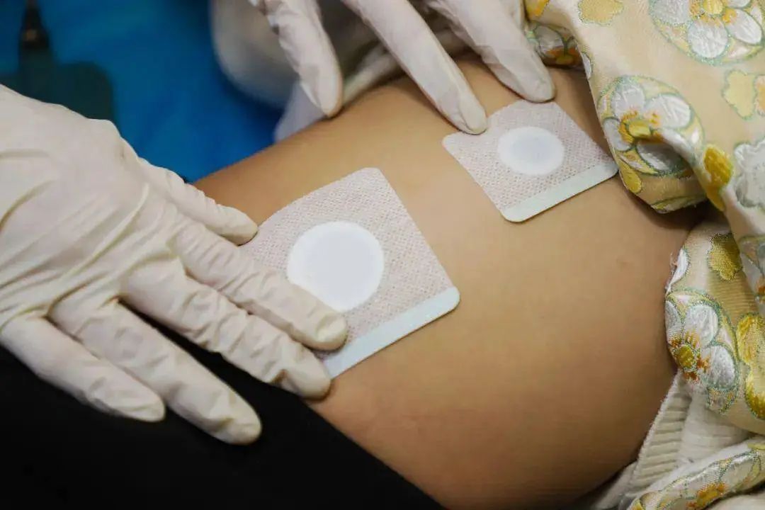 孩子仰卧在床上后,医生将药饼敷在腹部和背部的多个穴位上,通过中医定向透药治疗仪进行药物导入。20分钟后,医生更换新药饼,并嘱咐家长在孩子贴敷2~4小时后取下。